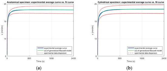 Experimental average strain–time curve (blue), fit obtained from the two-element Generalized Maxwell model (green), and experimental data dispersion (red dashed lines), for (a) anatomical and (b) cylindrical specimens.