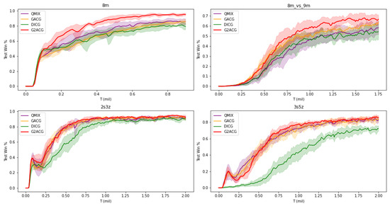 Performance of G2ACG and baseline algorithms on different SMAC map types. The x-axis represents the time steps (in millions), while the y-axis quantifies the test win rate in the games.