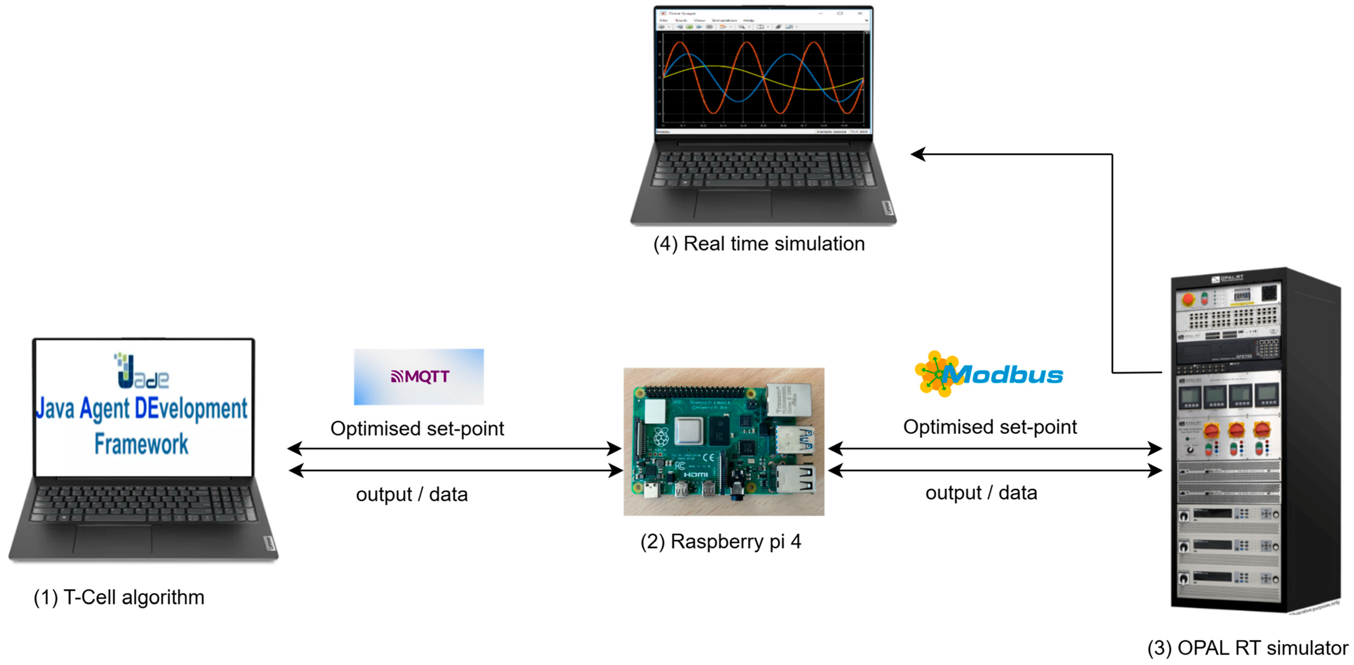 Figure 1 illustrates the complete architecture of the system, showing the set-point flow from T-Cell algorithm in Java to the OPAL-RT platform via MQTT and Modbus protocols, as well as the closed-loop feed-back mechanism. The figure is composed of four numbered blocks, and it is clarified as follows.