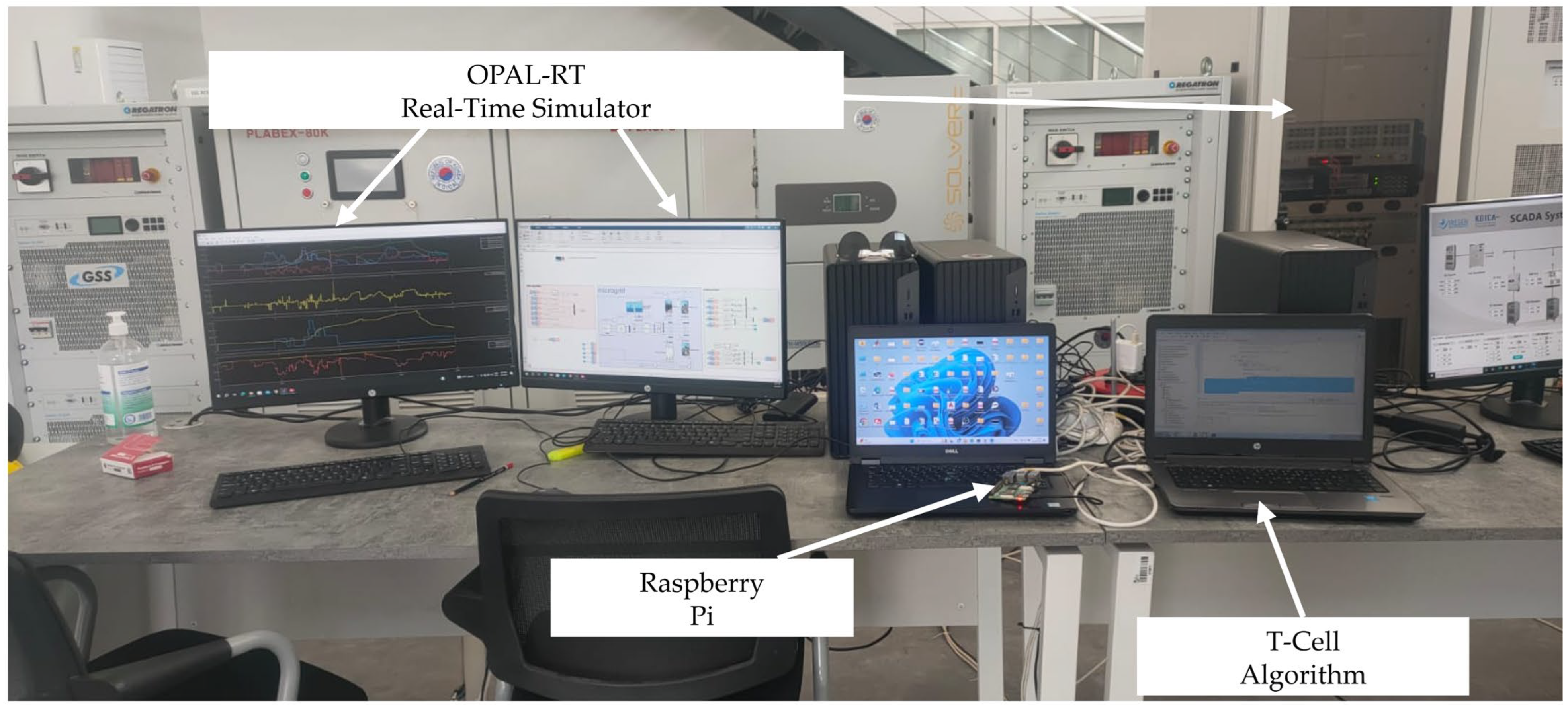 Figure 2, the experimental setup integrates three main elements: the OPAL-RT real-time simulator, the Raspberry Pi gateway, and the laptop running the T-Cell algorithm. The OPAL-RT simulator executes the detailed microgrid model and provides real-time measurements of voltages, currents, and power flows. The Raspberry Pi acts as a lightweight gateway, ensuring interoperability between the Java environment and OPAL-RT through MQTT and Modbus protocols. Finally, the T-Cell algorithm, implemented in Java on a laptop, computes the optimal set points for distributed resources. Together, these components enable a closed-loop cycle where set points are applied, feedback is collected, and re-optimization is triggered when deviations occur, thereby validating the proposed EMS under realistic operating conditions.