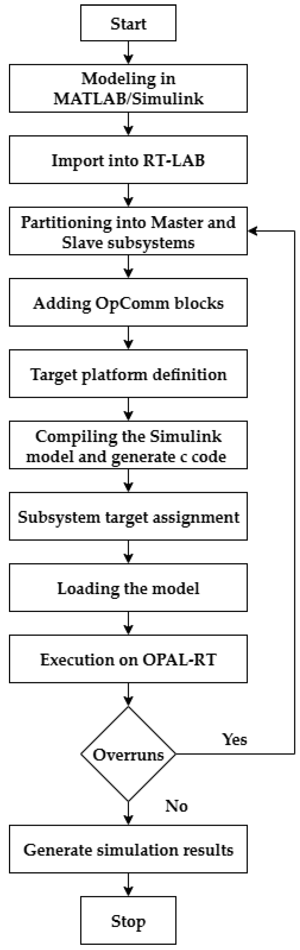 Figure 3 illustrates the workflow of integrating a MATLAB/Simulink (R2022b) model into the RT-LAB environment for execution on OPAL-RT hardware. The workflow starts with initial modeling generation in MATLAB/Simulink, which is then imported into RT-LAB for real-time implementation. Next, the model is divided into a Master Subsystem (SM) responsible for numerical computations and communication, and a Slave Subsystem (SC) that manages component-specific tasks. Communication between the subsystems and the hardware is enabled by virtue of OpComm blocks. Following this, the OPAL-RT target platform is defined, and the model is compiled automatically to C code for high-speed execution. Then the subsystems are assigned to processors to share calculation load, loaded on the test bench to test connectivity, and executed in real time. During execution, the system continuously monitors for overruns, which occur when computational time exceeds the real-time step. If overruns are detected, the process loops back to the partitioning step to optimize subsystem distribution and improve performance. Otherwise, the simulation continues and the results are generated.