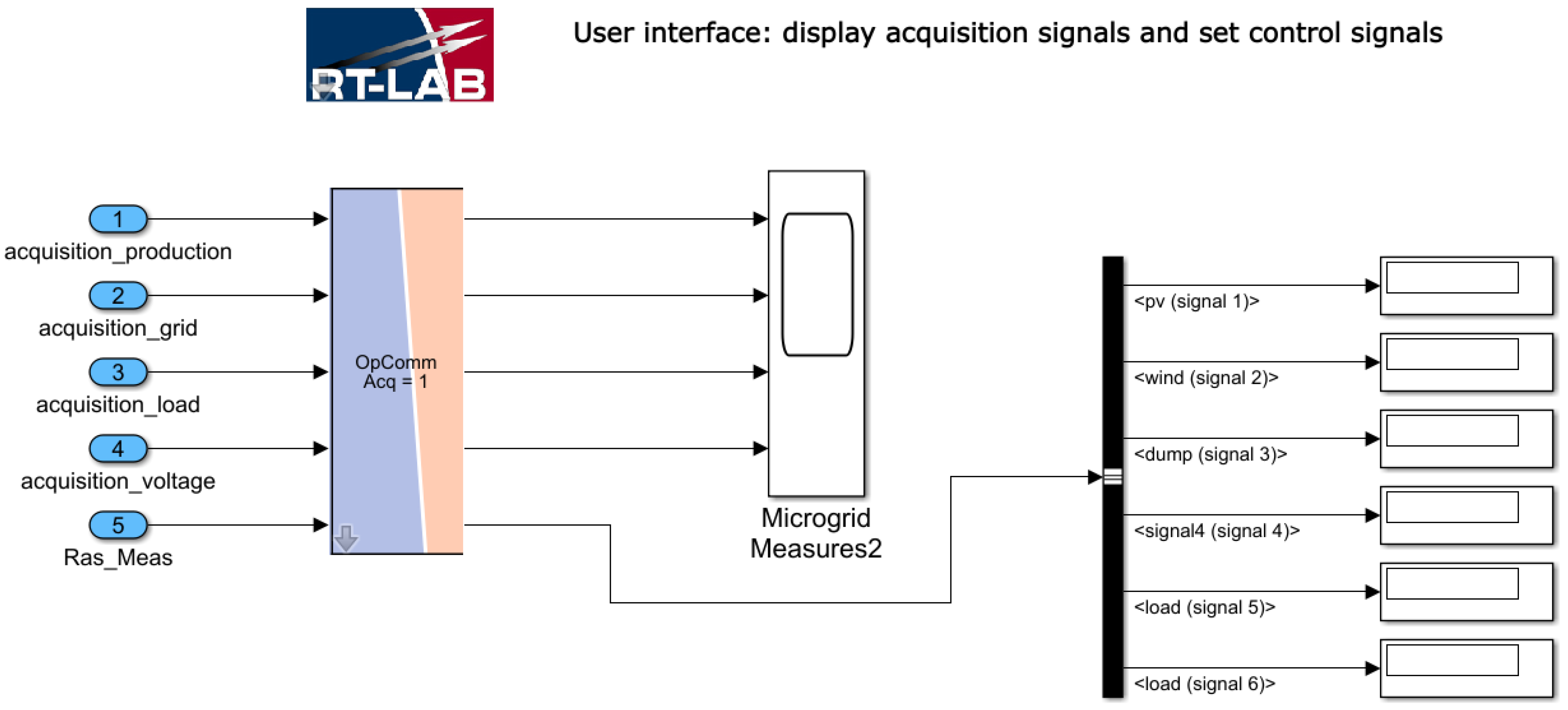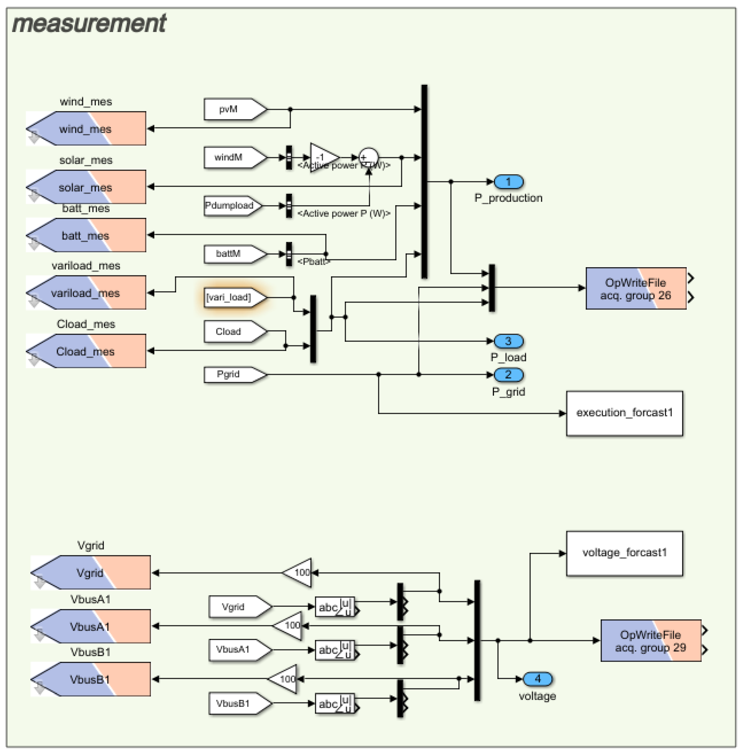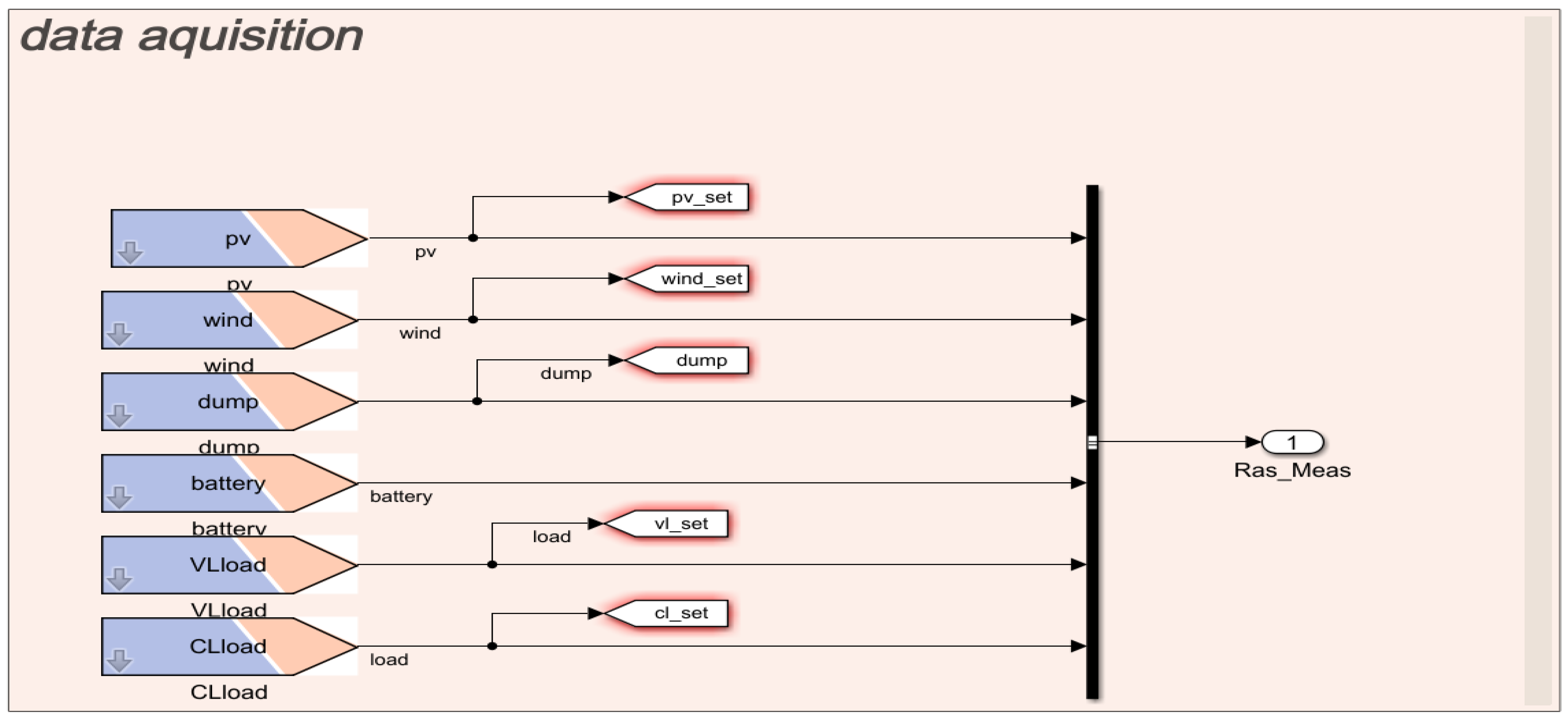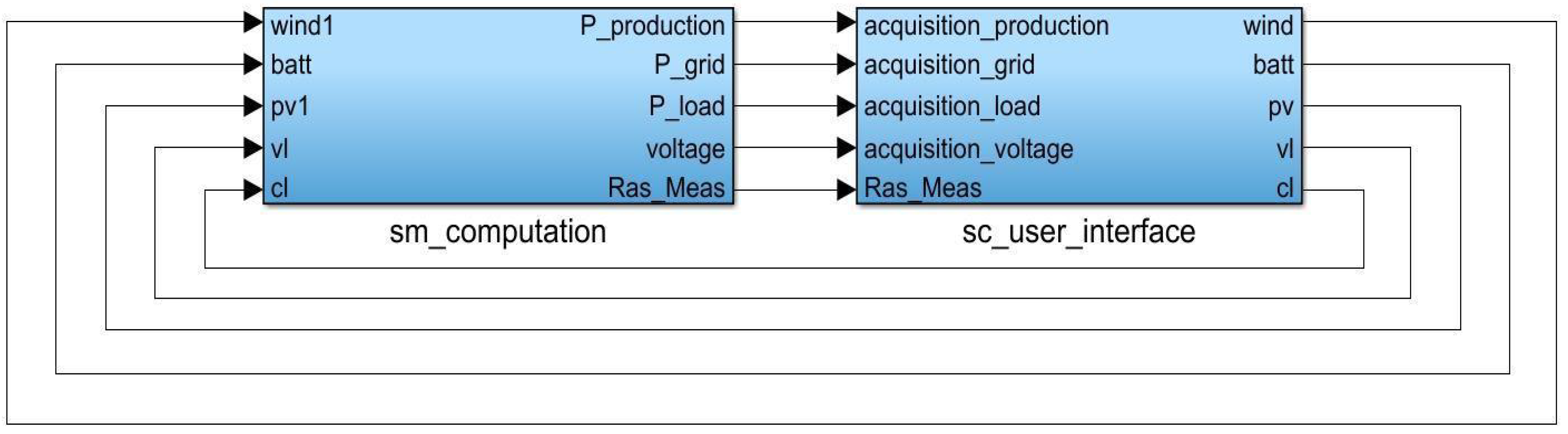 Figure 4 shows the development chain of a Simulink model running in real time on OPAL-RT. The SM, acting as the computational core, receives as input distributed energy loads and resource states: wind1 (turbine wind generation), pv1 (solar photovoltaic production), batt (batteries charging/discharging, and State of Charge (SOC)), vl (bus voltage), as well as cl (controllable load). From these inputs, it determines aggregate outputs such as P_production (aggregate generation output), P_grid (grid interchange output), P_load (aggregate load output), and voltage (aggregate bus measurements). These outputs are subsequently sent to SC for acquisition and visualization (acquisition_production, acquisition_grid, acquisition_load, acquisition_voltage), while the Ras_Meas signal preserves synchronism of both subsystems. Together, these mechanisms define how inputs and outputs flow in the architecture, linking physical system variables to the real-time optimization and monitoring framework.