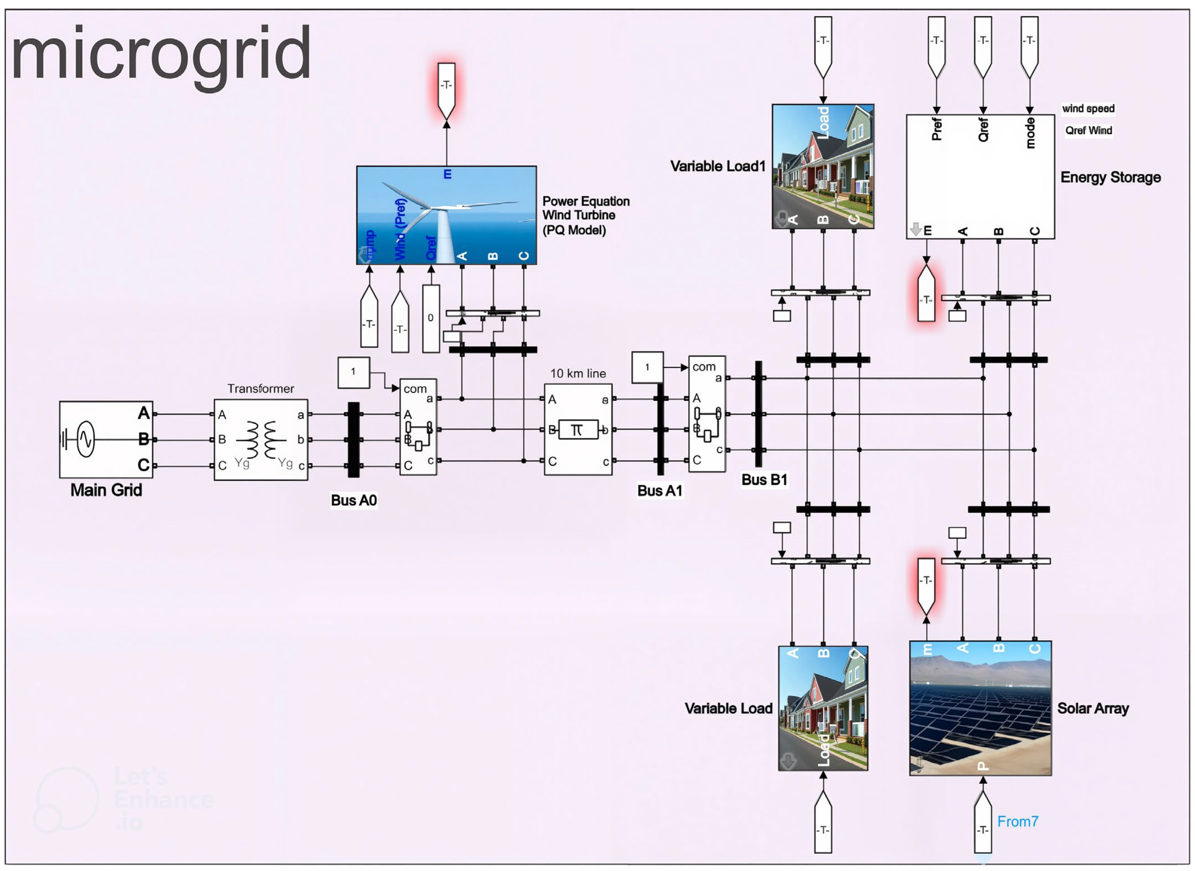 The microgrid under study comprises renewable energy sources, an energy storage unit, and both variable and controllable loads, all interconnected by distribution buses. The photovoltaic array and the wind turbine, both of which are modelled by a PQ model, supply renewable power, and the storage unit offsets production and consumption. The entire system is interconnected with transmission lines and fed into the main grid through a transformer and distribution buses (Bus A0, A1, and B1). The topology creates a hybrid system where renewable resources, storage units, and loads interact with the main grid dynamically. The overall system architecture is depicted in