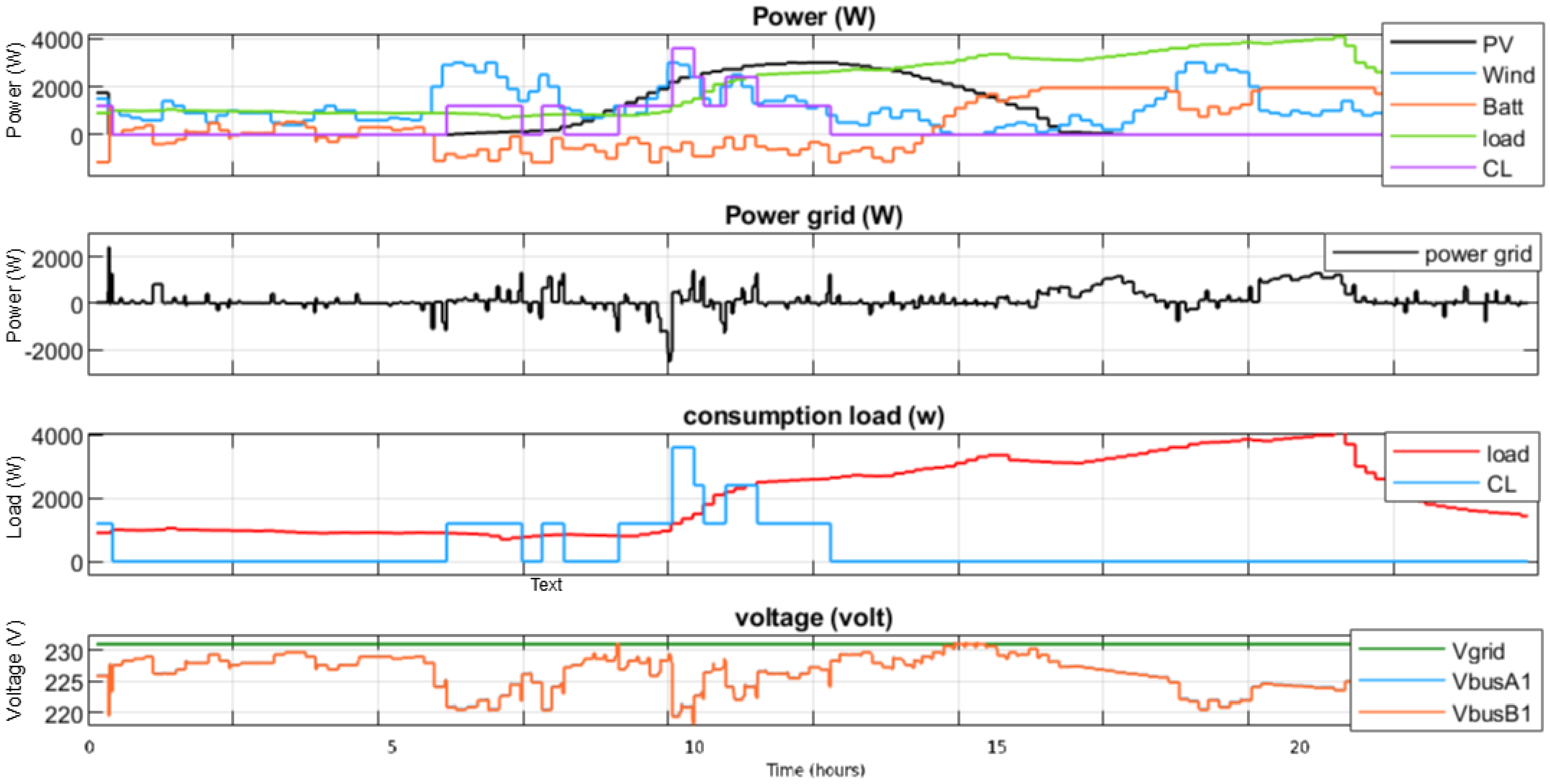 This result confirms effective management of energy distribution in a microgrid and smooth integration of photovoltaic production, wind production, battery storage, controllable loads, and total load. System stability is also guaranteed by maintaining the bus voltages within the optimum value range, which provides stability in the system. The algorithm will also minimize the exchanges with the main grid and improve its autonomy by promoting energy effectiveness in the microgrid.