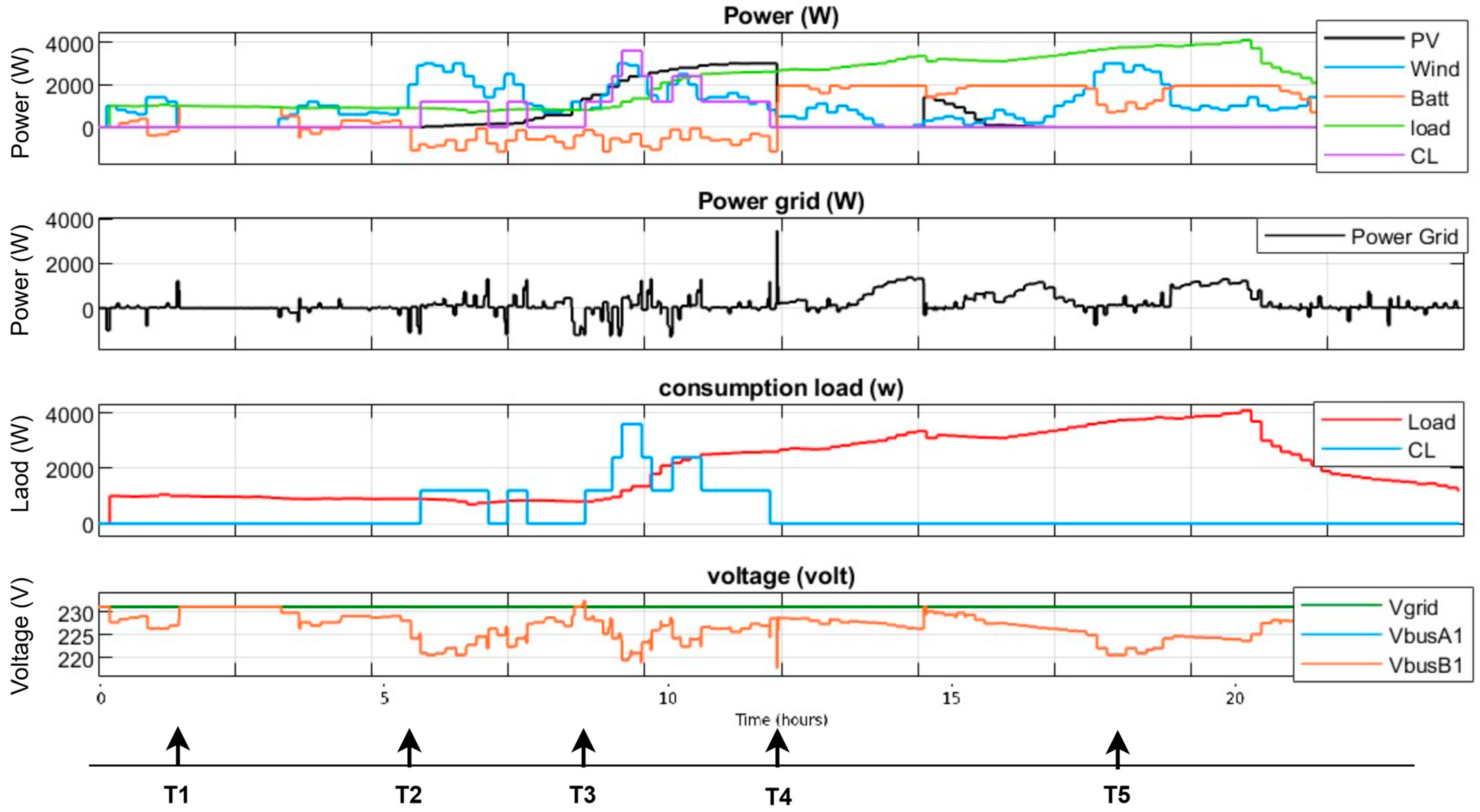 T2 (05:40): The load (900 W) is supplied by wind generation (3000 W). The excess is divided into charging the battery (900 W) and activating the controllable load (1200 W) with zero support from the grid. The measured voltage is maintained stable at 222 V with 0.965 p.u., well within the authorized range [0.95–1.05 p.u.].
