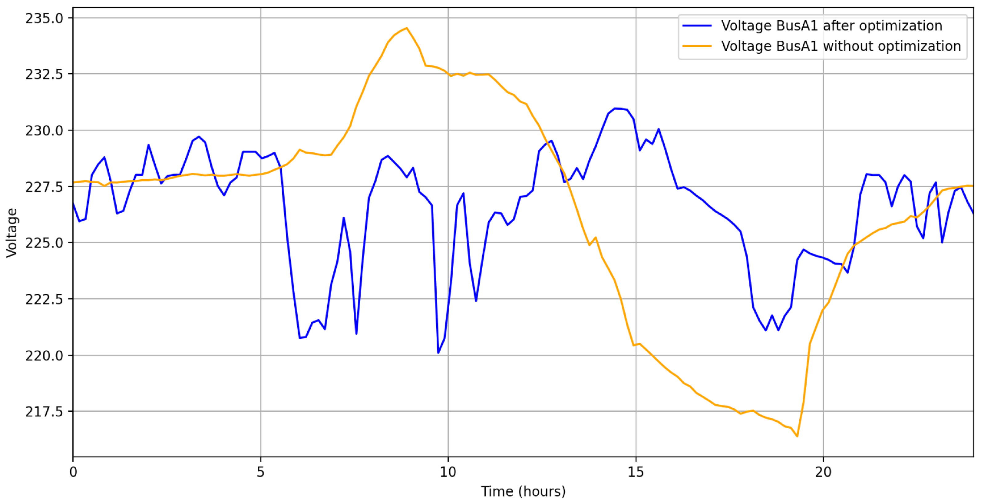 24] by introducing a voltage deviation penalty term in its objective function. This modification enables power distribution and maintains the voltage levels within an acceptable range (0.95–1.05 pu as defined by EN50160). A feedback system based on real-time measurements (OPAL-RT platform) triggers dynamic adjustments when deviations are detected, creating an innovative synergy between bio-inspired decision-making and technical grid constraints.