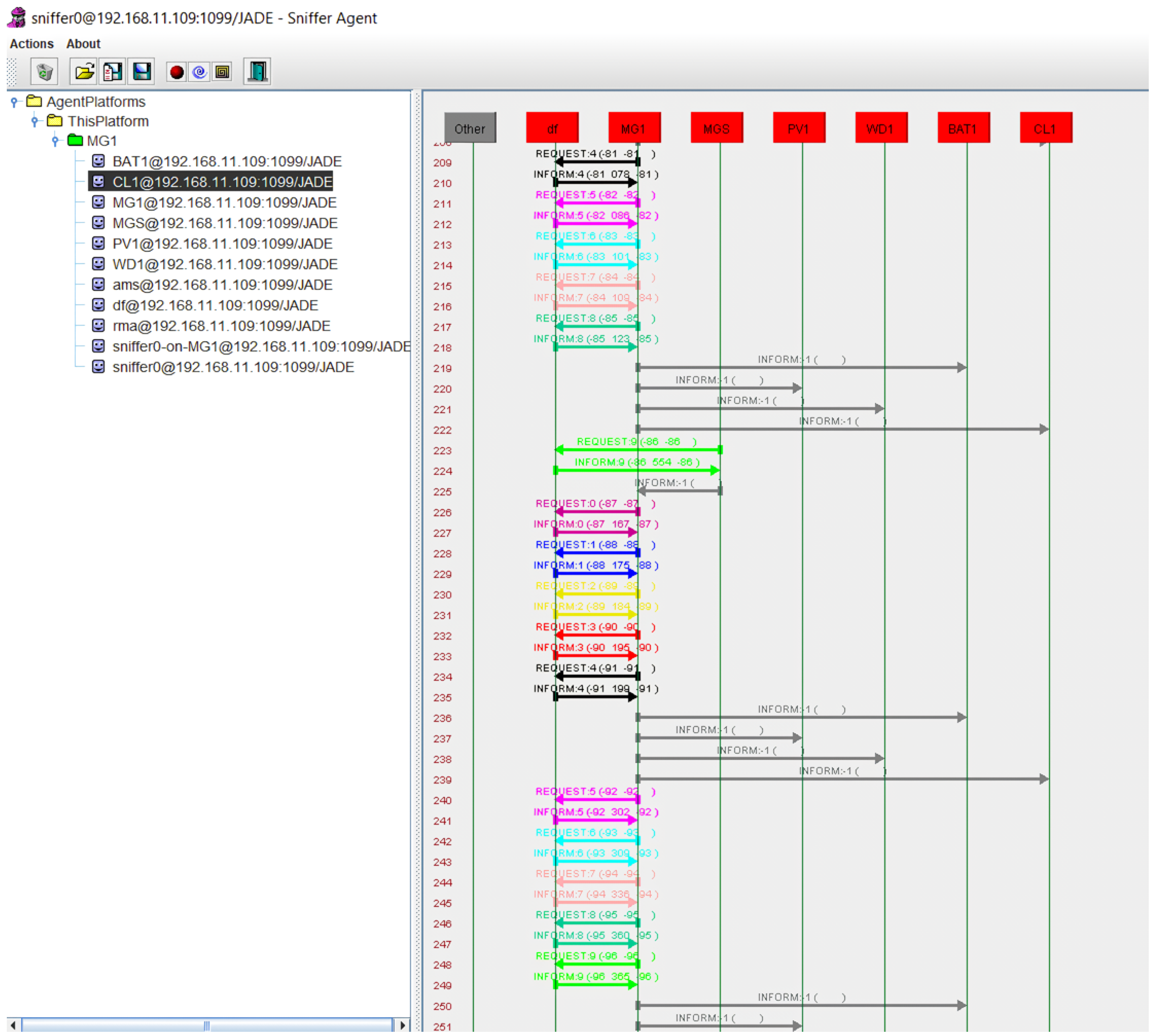 Figure 12 shows the Interaction between agents in the JADE platform. The PV, Wind, Battery, and Load agents communicate system states to the Microgrid Manager. The MGS is supervising voltage feedback and, in case of anomalies, requesting recalculated set points from the MGO. Arrows represent ACL message exchanges for data requests, responses, and set point dissemination. At line 223 in