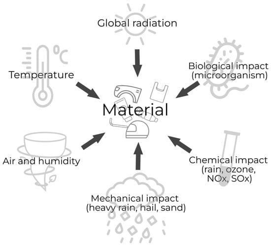 Physicochemical, biological, and mechanical impacts that can affect a material outdoors.