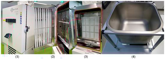 (1) Weathering chamber with closed door. (2) The door of the chamber is equipped with UV-A fluorescent tube lamps and filter glass. (3) Weathering chamber equipped with the sample holder. (4) Stainless steel rainwater reservoir.