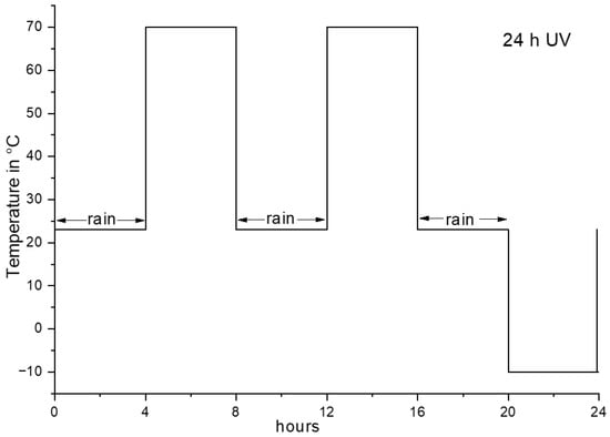 The applied weathering scenario simulates Central European average weather conditions in conformity with a standard method from RAL (German National Committee for Delivery and Quality Assurance). The programme shown in Figure 3 includes extreme weather phenomena, such as a high-temperature phase and long wetting periods. One cycle has a duration time of 24 h and consists of six stages with a time frame of four hours each. This circadian is repeated 42 times giving a duration of six weeks. One cycle consists of three raining periods at 23 °C, two high-temperature periods at 70 °C, and one freezing period at −10 °C with constant UV-A irradiation (at about 45 W m−2) using UV-A-340 nm fluorescent tube lamps (Figure 3). With this continuous irradiation, an acceleration factor of two is already obtained.