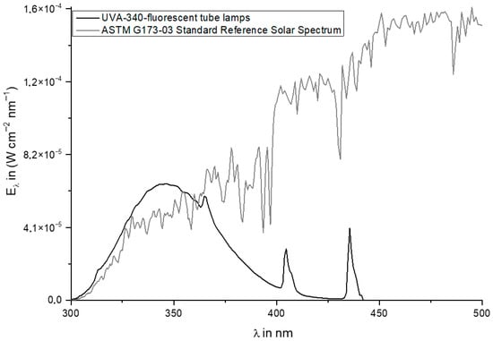 For the simulation of global radiation, 16 UV-A-340 fluorescent tube lamps (Atlas Material Testing Technology GmbH, Linsengericht, Germany) were used. Figure 4 shows the spectra obtained from these UV-A-340 lamps and a global radiation reference spectrum [11]. The reference spectrum shows the standard reference spectral irradiance for hemispherical solar irradiance incident on cloudless atmospheric conditions on a sun-facing, 37° tilted surface. The UV-A-340 lamps radiate in the range from 295 to 440 nm and thus simulate the high-energy small-wavelength range of global radiation (Figure 4). The spectral output of the UV-A-340 lamps is mainly in the UV-A region from 315 to 400 nm with a small part in the UV-B range. The radiation dose is 45 W m−2, and the spectral maximum at 340 nm has a radiation dose of 0.864 W m−2. The weathering chamber is equipped with a quartz glass filter that cuts off all wavelengths below 300 nm to avoid energy-rich radiation, which can break chemical bonds. Moreover, the part of the spectrum below 300 nm does not occur in global radiation but could trigger other degradation mechanisms which are not occurring at higher wavelengths. The UV-A radiation has no solar NIR (near-infrared) part in the spectrum, which can heat the surface of the weathered samples.