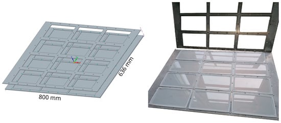 Sketch (left) and photo (right) of the self-designed sample holder made of aluminium (800 × 636 mm).