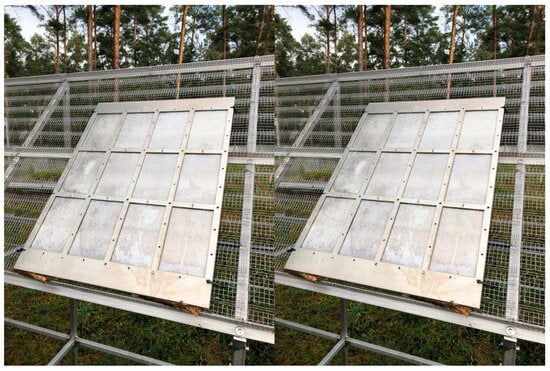 The samples were weathered outdoors in Horstwalde, Germany, in parallel (52°05′44.6″ N, 13°24′34.1″ E). They were placed in the same sample holder as in the weathering chamber and positioned on a weathering rack at a 45° angle to the south, according to ASTM D1435 (Figure 6) [6]. Weather report with data for temperature, duration of sunshine, and rainfall is provided by the DWD (German Weather Service).
