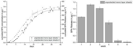 The moulded samples made of polycarbonate with a very low content of UV absorber were weathered in duplicate for six weeks in the weathering chamber. The higher cumulated released BPA in the 35 L water reservoir is 3.49 ± 0.05 µg L−1 and 397.2 ± 8.2 µg m−2 (Figure 7) correlated to the complete weathered surface area. Both curves show an s-shaped cumulated release profile with an increasing slope until day 20 (Figure 7). In the beginning, the weathering with UV-A-light (simulated global radiation), heat, and water induces degradation processes, like photooxidation, hydrolysis, and the migration of residual BPA [8,15,16]. This leads to a subsequent release of Bisphenol A. From day 21, the slope becomes smaller and smaller until after 28 days, a steady-state plateau without further release is reached. It is possible that the weathered and thus aged or oxidised layer protects against or slows down further release. Mercea et al. also mention the adsorption of BPA on the PC sample surface in batch experiments when a certain concentration is reached or a remigration into the PC as possible causes [17]. This can be observed here as a steady state or plateau effect.