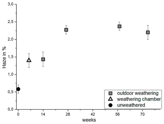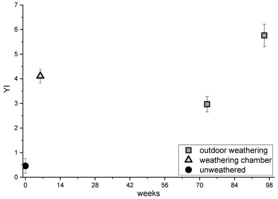 Figure 9 shows the average values of the yellowness indices of the unweathered reference samples, the samples weathered outdoors (for 73 and 96 weeks), and the samples weathered in the weathering chamber. The error bars represent the standard deviation. The yellowness index measured in transmission is 0.5 for the unweathered and 4.11 after six weeks in the weathering chamber. The yellowness index after 73 and 96 weeks is 3.0 and 5.8. The yellowness index increases for samples weathered in the weathering chamber and for those weathered outdoors. This is to be expected since they are unprotected.