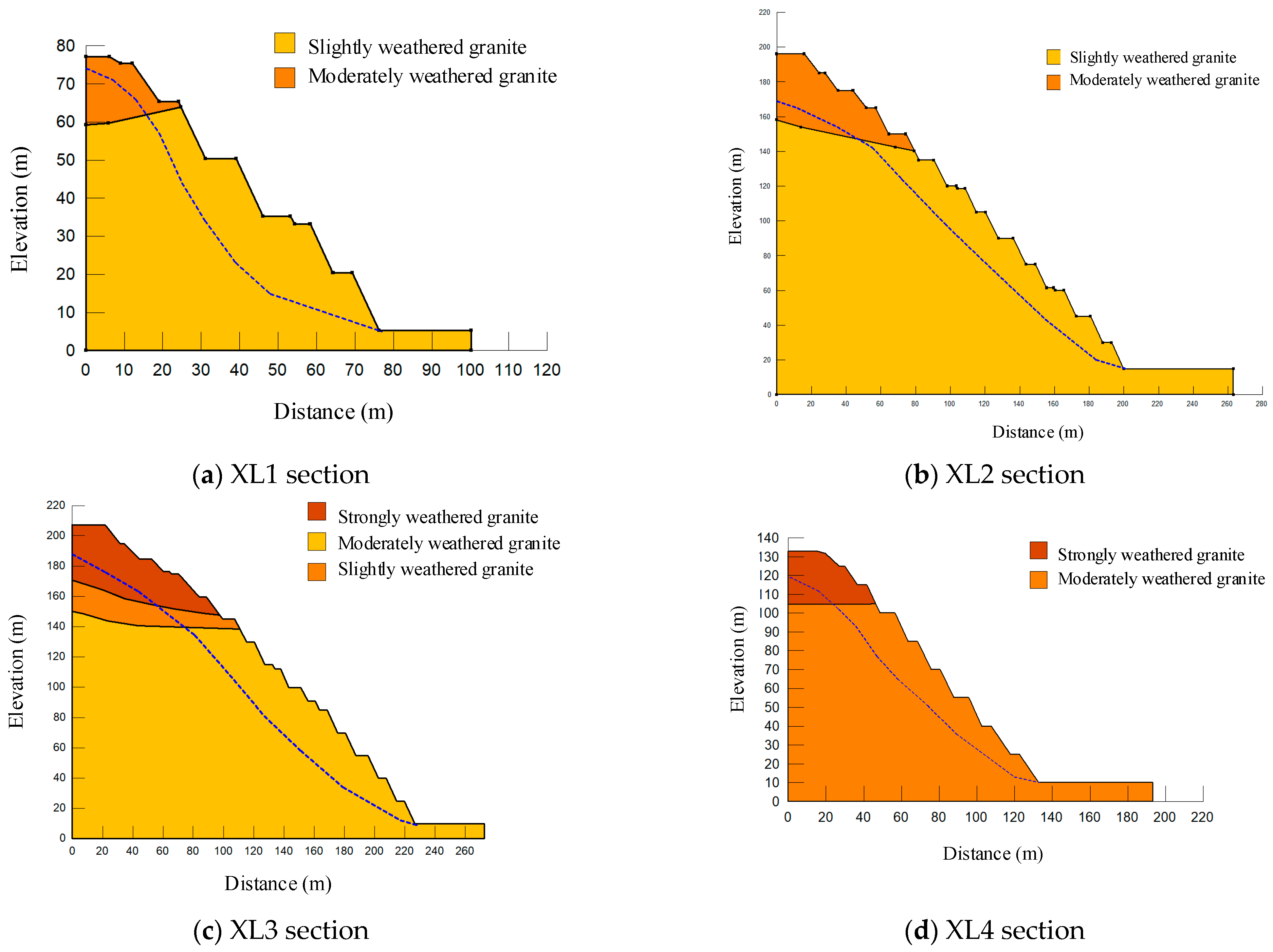 - Through overall stability calculations of the designed pit slopes under three working conditions scenarios, the overall slope safety factors meet the specification requirements. However, the safety factor for the localized highly weathered layer in Section XL3 does not satisfy the requirements. After optimizing the slope angle of the highly weathered layer in the designed slope Section XL3 from 38° to 37°, its safety factor meets the specification requirements.