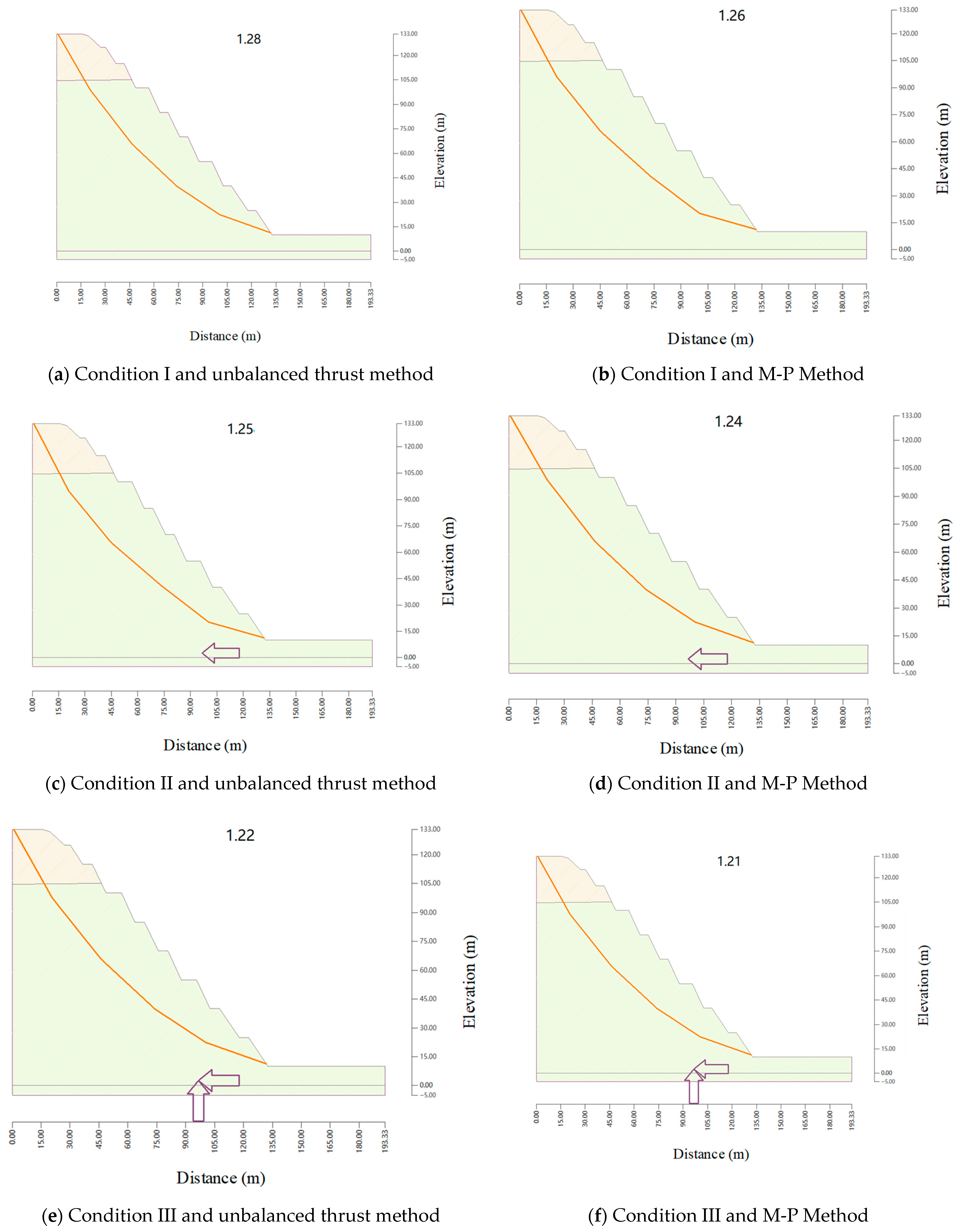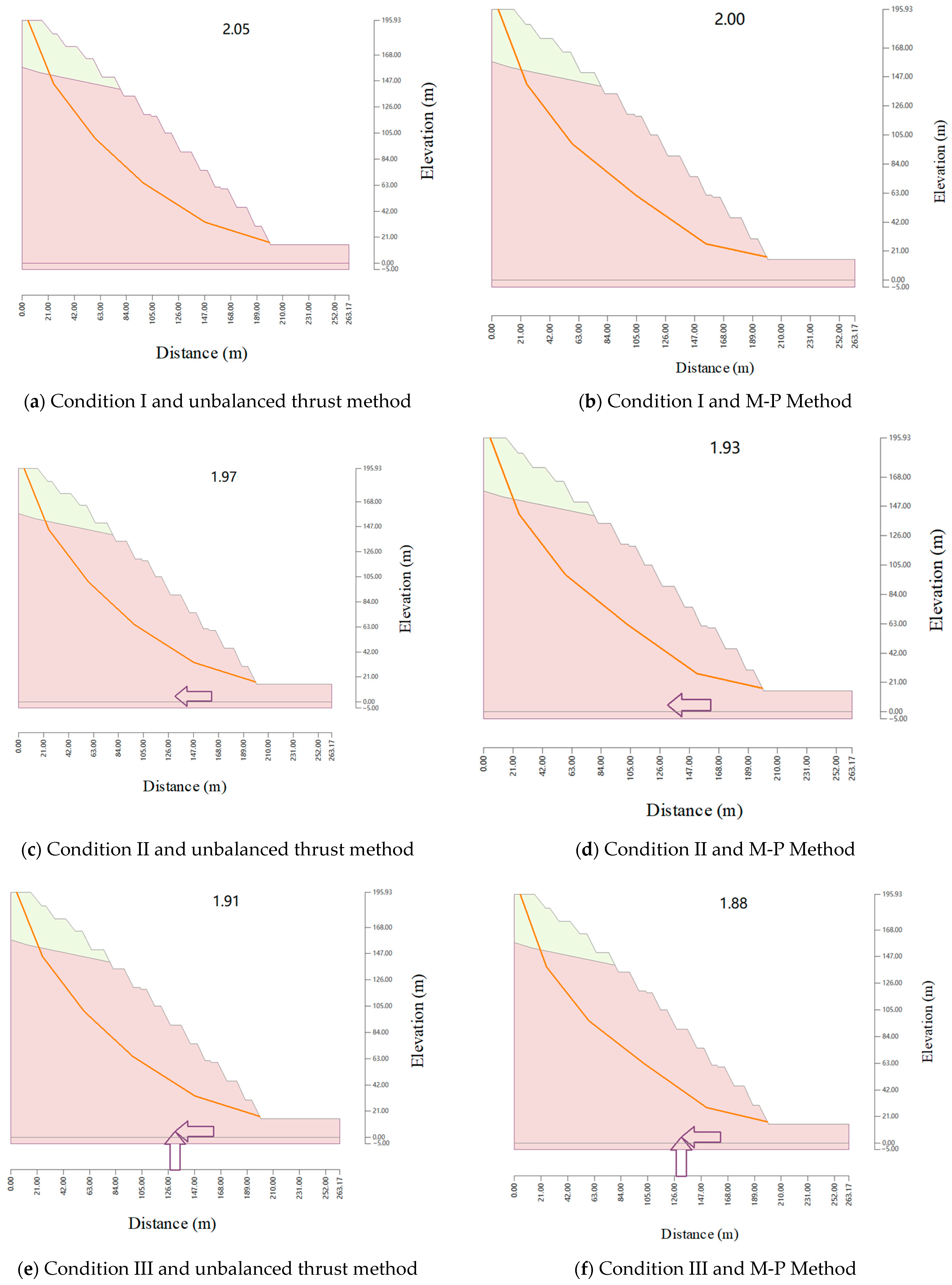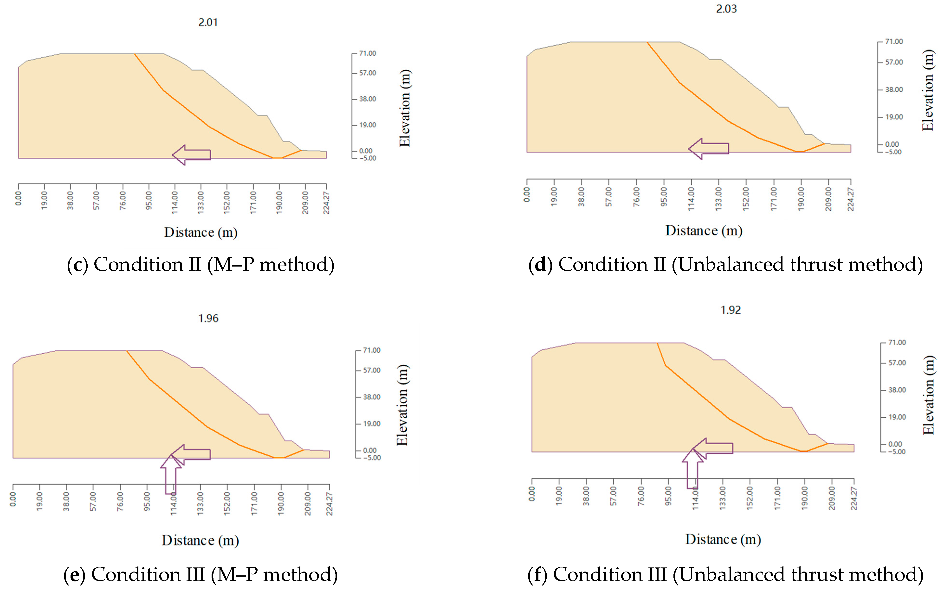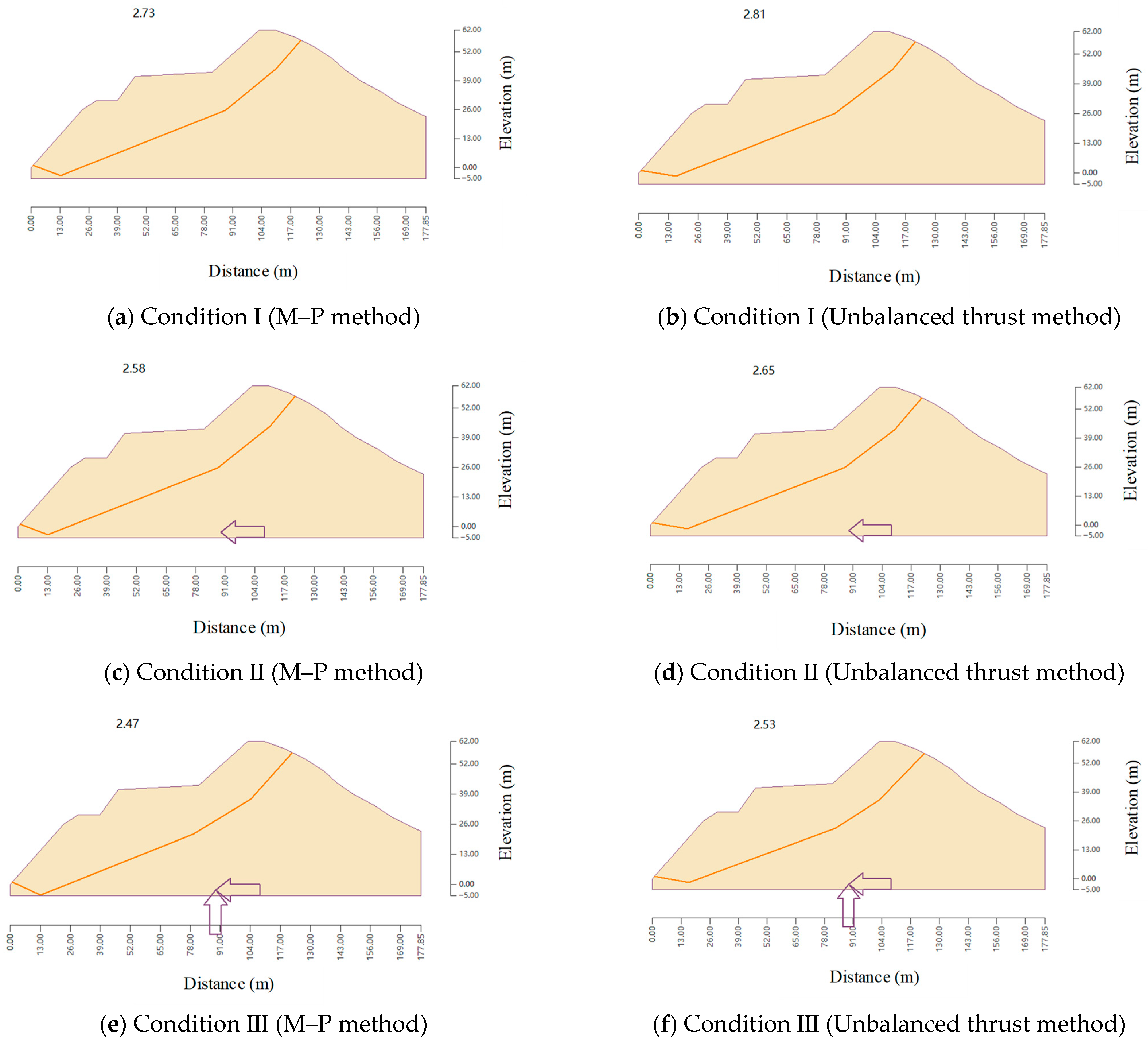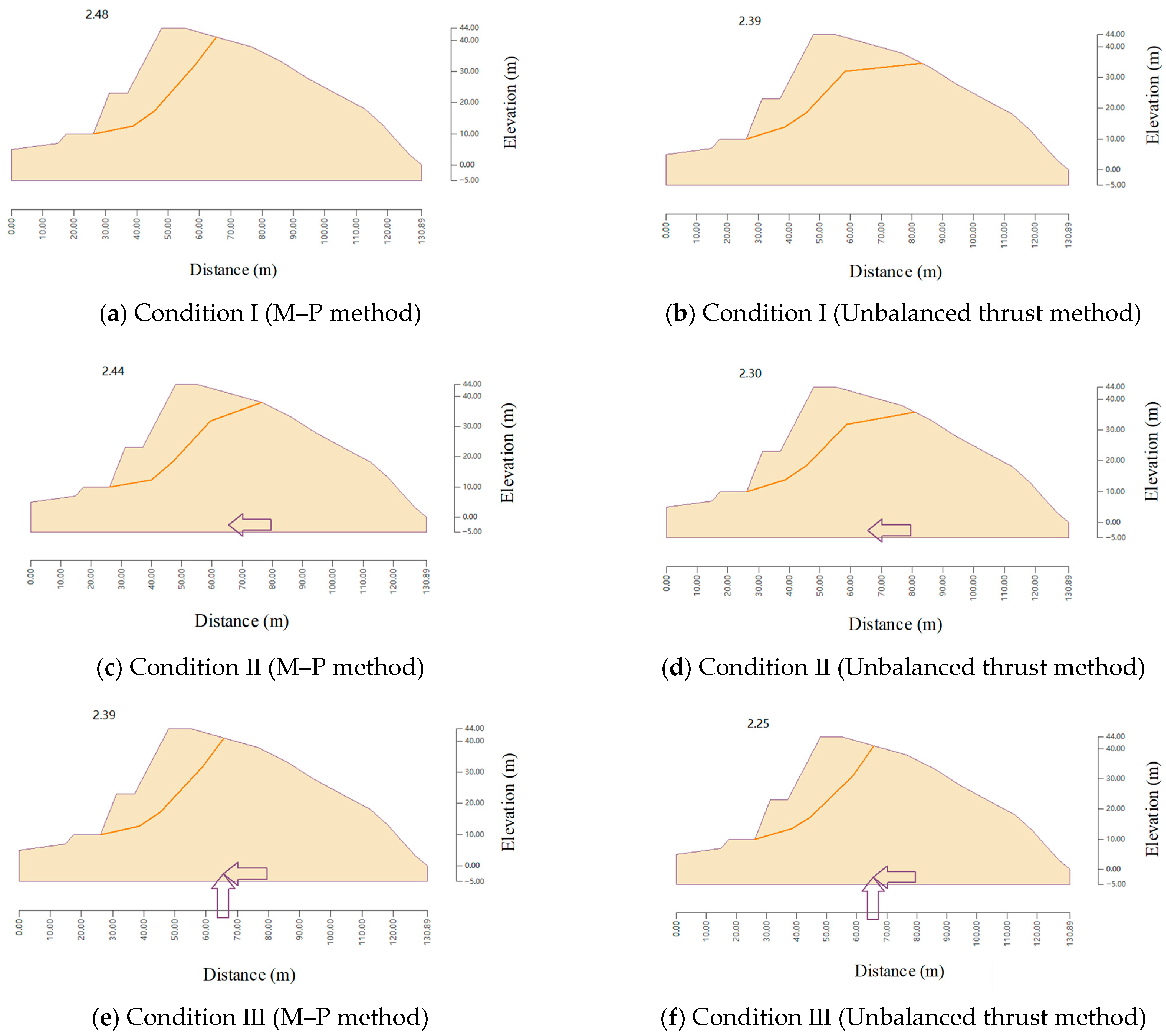 | Unbalanced Thrust Method | M–P Method | Select a Value (min{FBishop, FM-P}) | Judge | ||