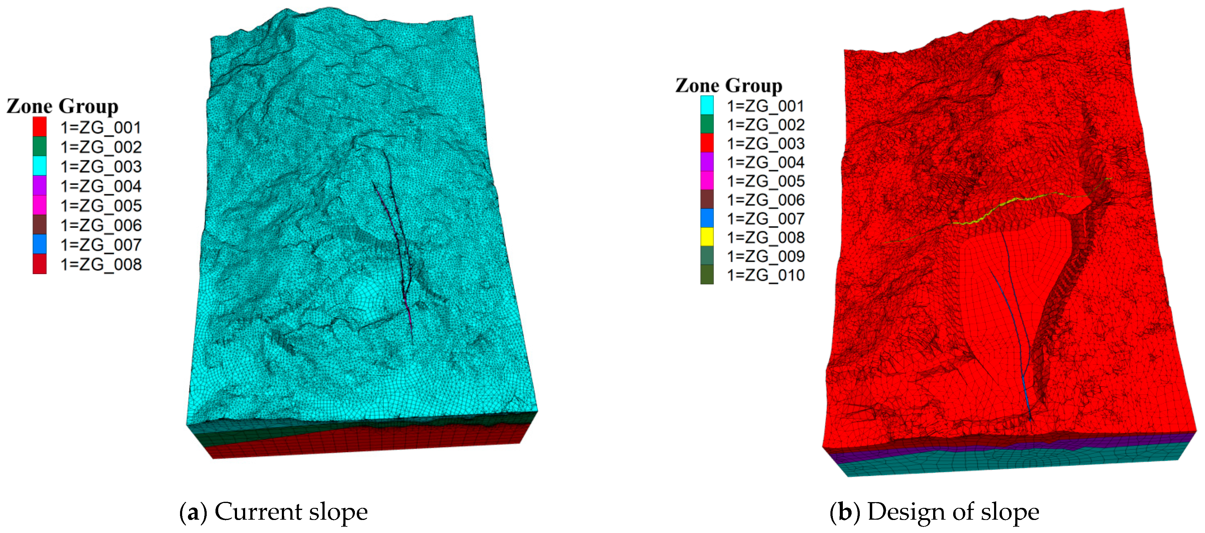 - Siddique, A.; Tan, Z.; Tan, N.; Ahmad, H.; Li, J.; Liu, J.; Khurram, S.H.; Jiang, Y.; Zeng, N. Remote Sensing and Numerical Simulation for Slope Stability in Open-Pit Mining: Case Study of Sijiaying Iron Ore Mine, China. Geotech. Geol. Eng. 2025, 43, 290. [Google Scholar] [CrossRef]