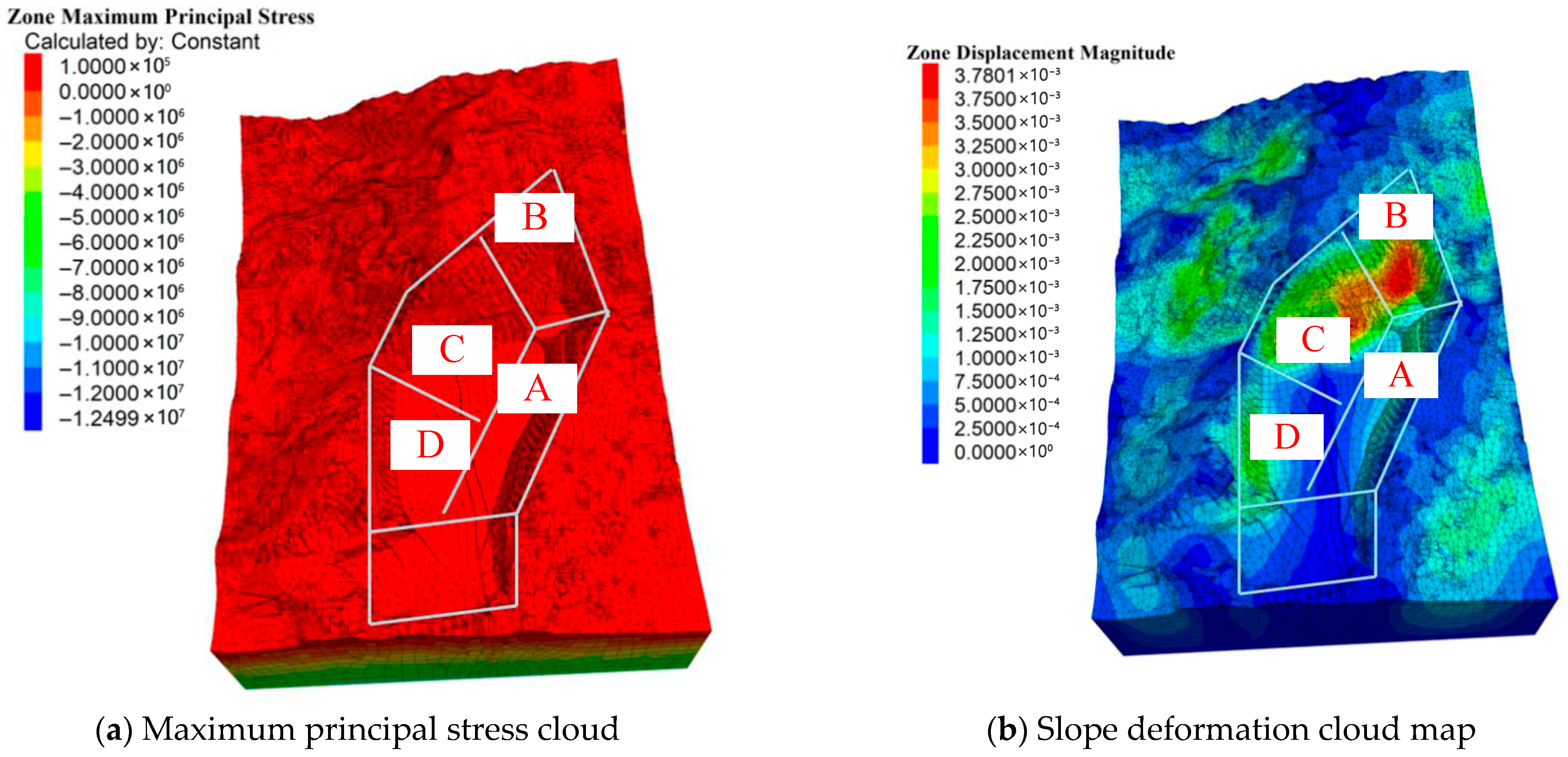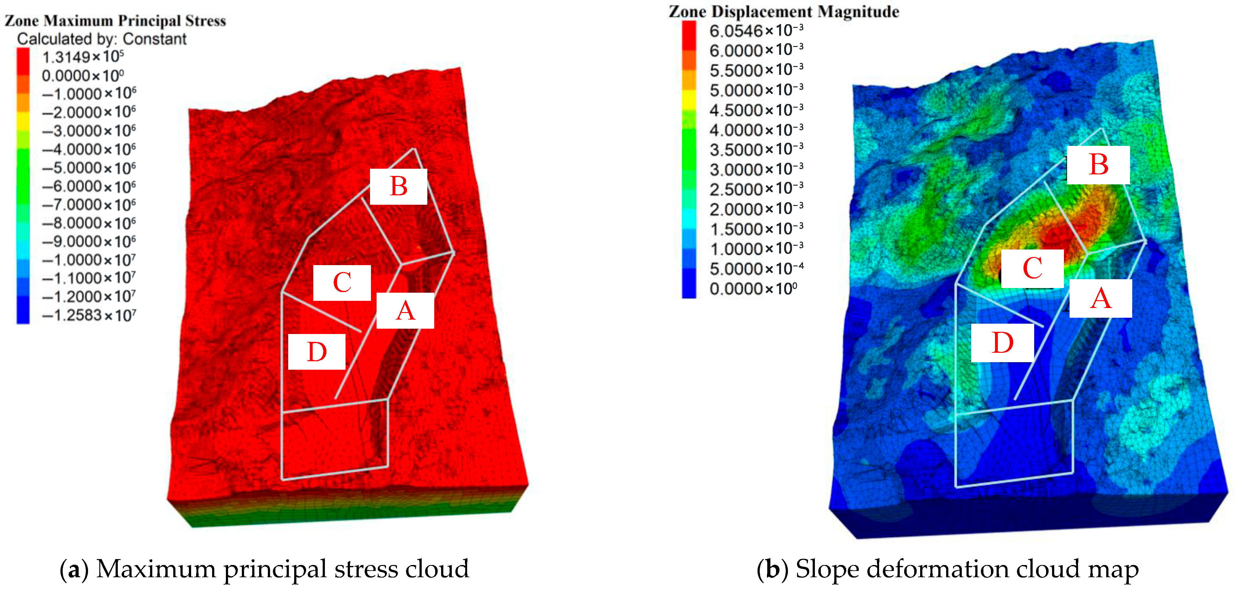 - The following evaluation conclusions are obtained through three-dimensional slope stability analysis and calculations: The deformation zones in the existing slopes are mainly concentrated in the middle-lower sections of the high slopes on the western side. The deformation zones in the designed slopes are primarily located in the middle-lower sections of slopes in Zones B and C, with faults situated at the center of the deformation belts. Rainfall, blasting, and seismic action significantly increase the tensile stress on the slope surfaces, leading to increased deformation and exerting a substantial influence. Special attention to risks and enhanced real-time monitoring are required during the excavation of the middle-lower sections of slopes in Zones B and C.