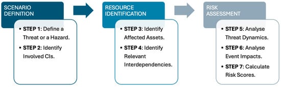 The methodology introduces a structured, scenario-driven framework that integrates conventional risk assessment techniques with cross-operator interdependency modelling, and context-aware hazard/threat sensing [,,,]. Developed for complex, multi-stakeholder environments, the approach supports real-time and anticipatory risk assessment across interdependent CIs, with particular emphasis on cascading and compounding risks within and across CIs. The methodology includes seven sequential steps, as illustrated in Figure 1 and further elaborated below.
