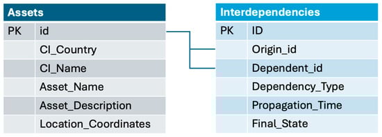 To represent these dependencies, the methodology employs a (mainly qualitative) data model that records the identifiers of origin and dependent asset, their basic information, dependency type, estimated propagation time, and descriptive information about the failure impact/final state. The data model is presented in Figure 2.
