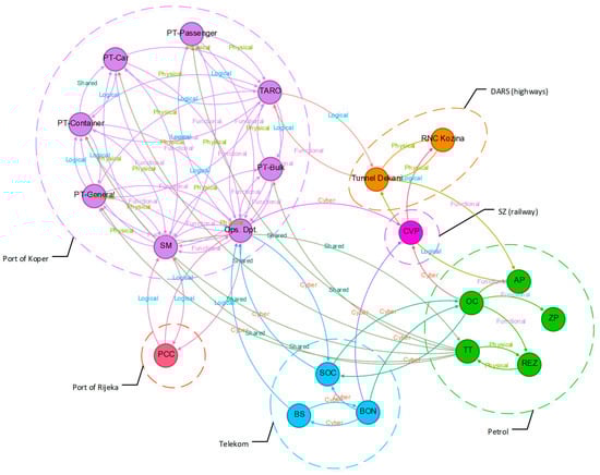 Illustrative example interdependency graph for the LSP#1 SI-Cyber scenario. Nodes represent specific CI assets (e.g., PCC is Port Control Centre at Port of Rijeka, Croatia); dashed circles indicate individual CIs. Arrows denote unidirectional dependencies, with labels specifying the dependency type as defined in Table 1.