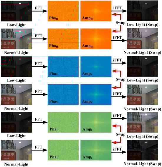 The restoration effects achieved by swapping the amplitude components (Amp) among the three HVI channels of an image pair (low-light and normal-light) in the Fourier domain while retaining their phase components (Pha). “FFT” and “iFFT”, respectively, represent the Fourier transform and inverse Fourier transform.