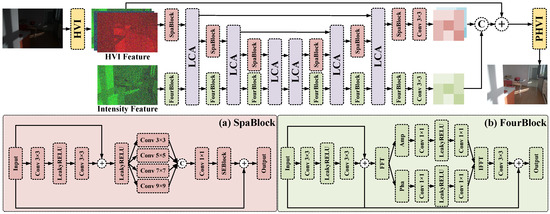 This section presents the proposed HVI-based spatial–frequency-domain multi-scale fusion LLIE method (abbreviated as HVI-FourNet). As shown in Figure 2, HVI-FourNet adopts a dual-branch U-Net architecture. Its spatial-domain and frequency-domain branches, respectively, utilize SpaBlock and FourBlock to extract HVI features and intensity features in three encoding stages and three decoding stages. In each decoding stage, feature interaction enhancement is achieved through the Lighten Cross-Attention (LCA) [15] module, and the enhanced image is finally obtained after the inverse HVI transformation.