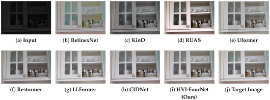 Qualitative Comparison. To visualize the enhancement effect of our method, we randomly selected one image from each of the LOL-v1 [50], LOL-v2 [51], and MIT-5k [52] datasets for comparison. As demonstrated in Figure 3, Figure 4 and Figure 5, our approach consistently generates predicted images that exhibit superior visual correspondence with the target images when compared against some state-of-the-art methods. The LOL-v1 dataset evaluation (Figure 3) reveals our method’s exceptional capability in recovering intricate details from severely underexposed areas, particularly in challenging scenarios involving wall textures and object surfaces, while simultaneously achieving remarkable noise suppression and artifact reduction, where RetinexNet [50], KinD [64], RUAS [9], Uformer [65], and LLFormer [67] show noticeable deficiencies. Moreover, our approach outperforms Restormer [66] and CIDNet [15] in terms of color fidelity and the generation of natural-looking daylight illumination. The slightly inferior illumination rendering of CIDNet, observable in the unnatural shadows on the upper cabinet area, is likely due to its limited ability in coordinating global and local illumination consistency. In contrast, our method preserves more coherent and natural lighting across the entire scene.
