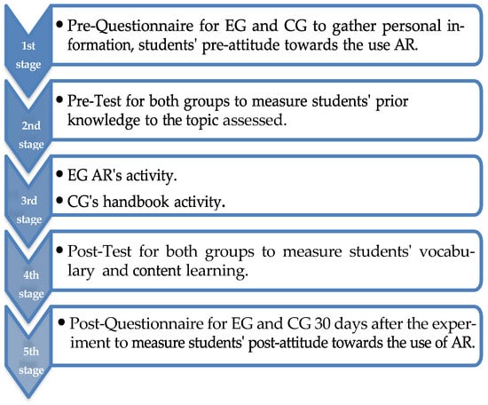 We conducted a classroom-embedded, sequential mixed-methods study with two parallel groups. Students completed the same CLIL content and vocabulary targets delivered in two modalities: an Augmented Reality (AR) lesson (Experimental Group, EG) or an equivalent print handbook (Control Group, CG). The design isolates delivery mode as the only manipulated variable while holding content, timing, and tasks constant.