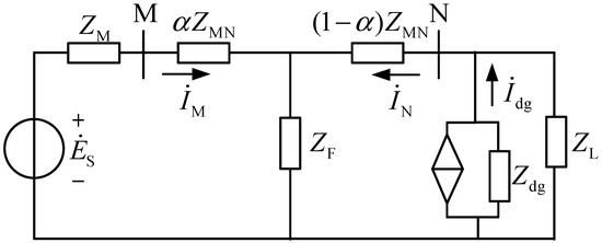 When an internal fault occurs on line MN, the output current of the IIDG is controlled by power electronic devices. It can be considered that the IIDG still satisfies the superposition principle and is equivalent to a current source in the fault additional network. Figure 2 shows the equivalent network diagram of the active distribution network containing the IIDG.