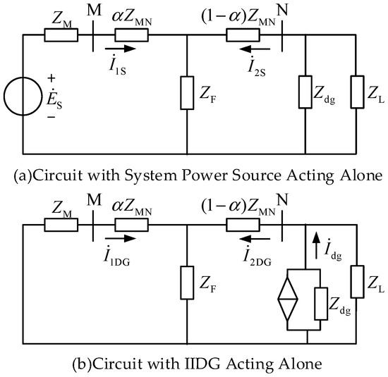 According to the superposition principle, the system in Figure 2 can be decomposed into equivalent networks where the system power source and the IIDG act separately.
