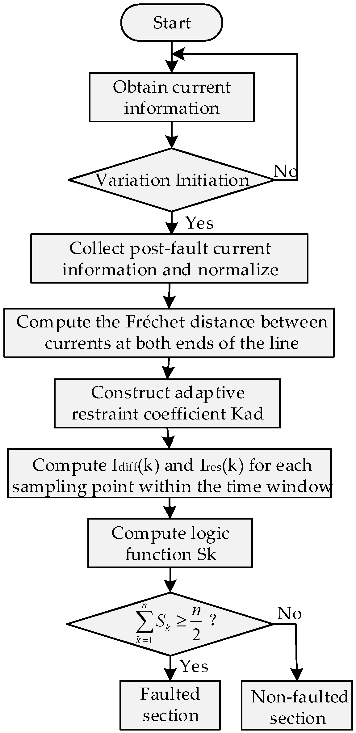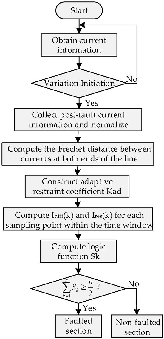 After protection initiation, the current information at both ends of each line is first collected and normalized; the Fréchet distance algorithm is then used to quantify the waveform similarity of the currents at both ends of the protected line, from which the adaptive restraint coefficient can be derived. The obtained restraint coefficient and the current data of each sampling point within the data window are substituted into the differential protection operating criterion to further calculate the logic function corresponding to each sampling point. Finally, by comparing the logic function result with the number of sampling points, fault occurrence is determined: when the calculated logic function result is not less than 0.5 times the number of sampling points, it is judged as an internal fault, requiring a trip signal to be issued and the faulted line removed; otherwise, it indicates no fault within the protected section.