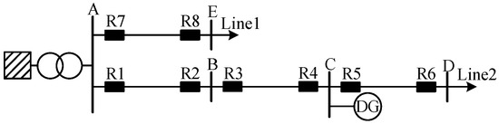 In recent years, increasing energy demands and global warming have made the development of new energy sources particularly important. DG such as solar and wind power has been extensively integrated into distribution networks due to its advantages of being renewable, abundant, and pollution-free [1,2]. This significantly reduces fossil energy consumption and markedly enhances system power supply reliability. However, the integration of DGs has transformed traditional distribution networks from single-source radial networks into multi-terminal supplied networks. Under normal operating conditions, load currents and post-fault short-circuit currents may flow bidirectionally under different operational modes [3,4,5]. The uncertainty in current magnitude and direction affects the operating characteristics of traditional distribution protection schemes, potentially causing maloperation or failure to operate, which in severe cases may endanger equipment, personnel safety, and system stability [6,7]. Therefore, there is an urgent need for more sensitive and reliable line protection methods in distribution networks.