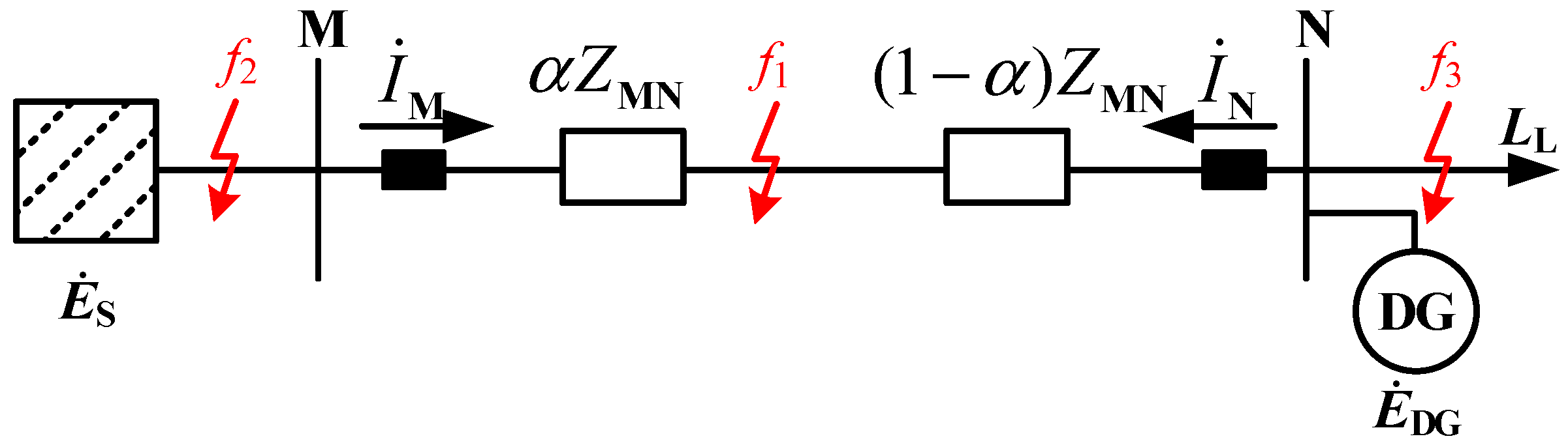 The schematic diagram of the active distribution network containing an IIDG is shown in Figure 1. Es denotes the electromotive force (EMF) of the main system source, EDG denotes the EMF of the IIDG, IM and IN denote the currents at both ends of the protection zone, LL denotes the load connected at the end of the feeder; ZMN denotes the equivalent impedance of feeder MN; f1 denotes the internal fault point, f2 and f3 denote external fault points; α denotes the position coefficient of f1.