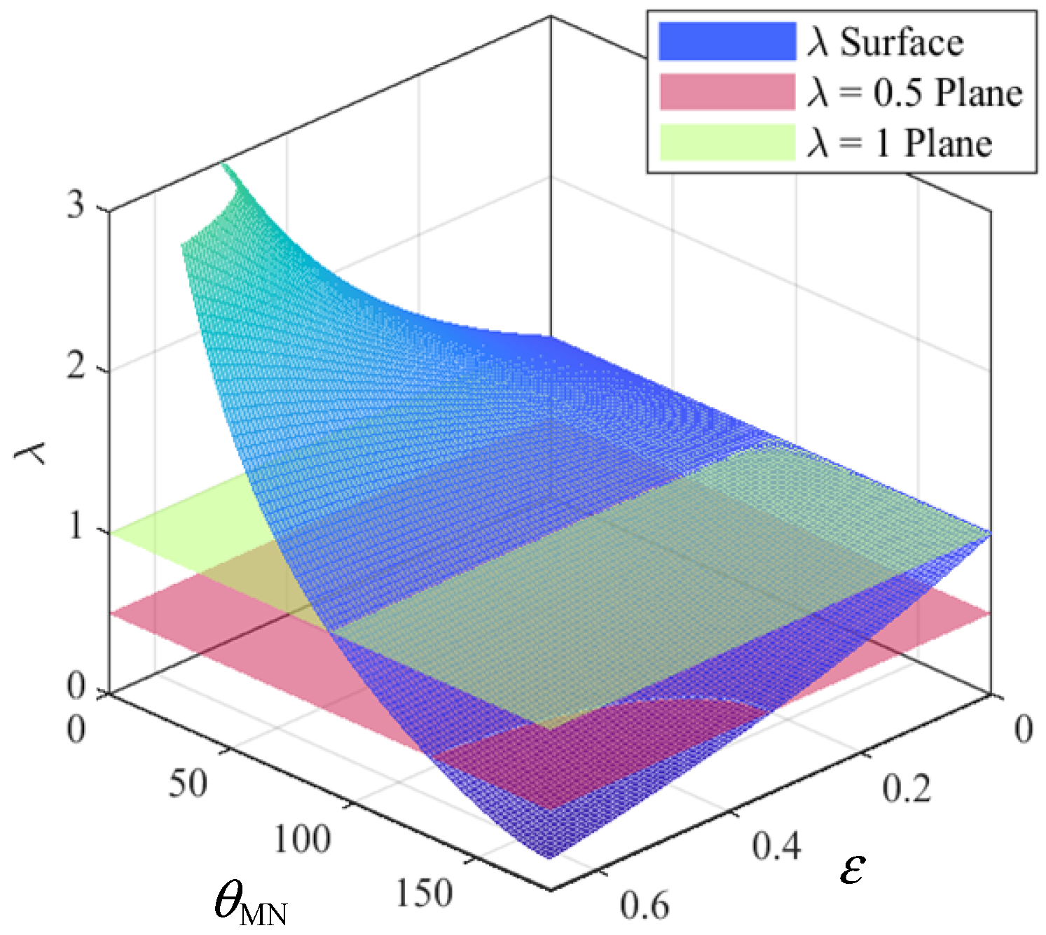 Equation (8) shows the restraint coefficient is determined by ε and cosθMN, where ε relates only to the amplitude characteristics of the currents at both ends, and cosθMN depends solely on their phase angle characteristics. The relationship between the restraint coefficient λ, ε, and θMN is illustrated in the planar graph shown in Figure 4.