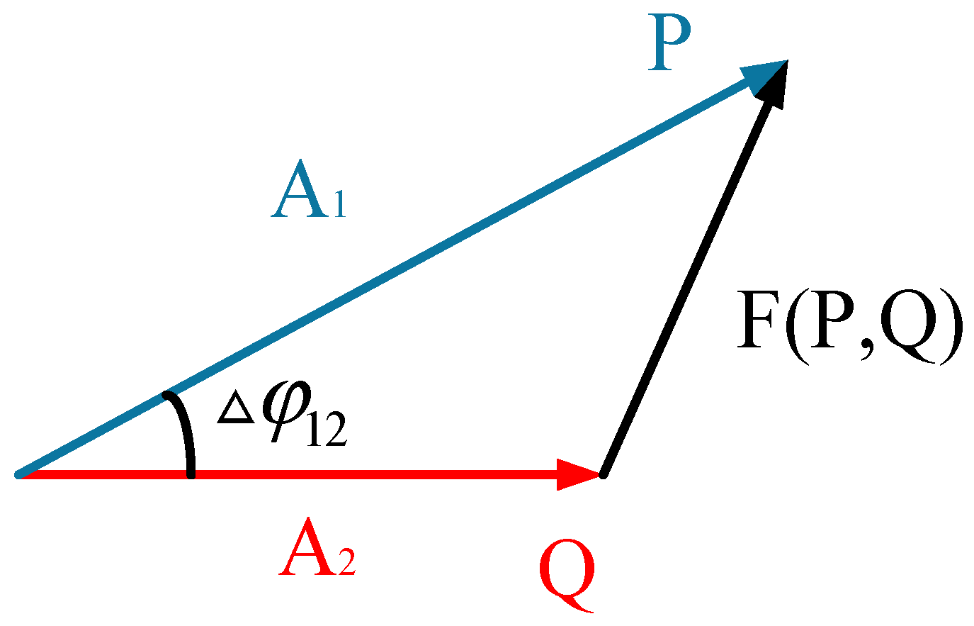 When the selected time window exceeds half a cycle, the amplitude of the extracted signal becomes independent of time, as shown in Equation (11). Its form is analogous to the Law of Cosines. Therefore, the physical interpretation of the Fréchet distance for sinusoidal signals of the same frequency can be represented by Figure 6. It can be observed that the Fréchet distance between sinusoidal signals P and Q is essentially the magnitude of the vector difference between the two signals.
