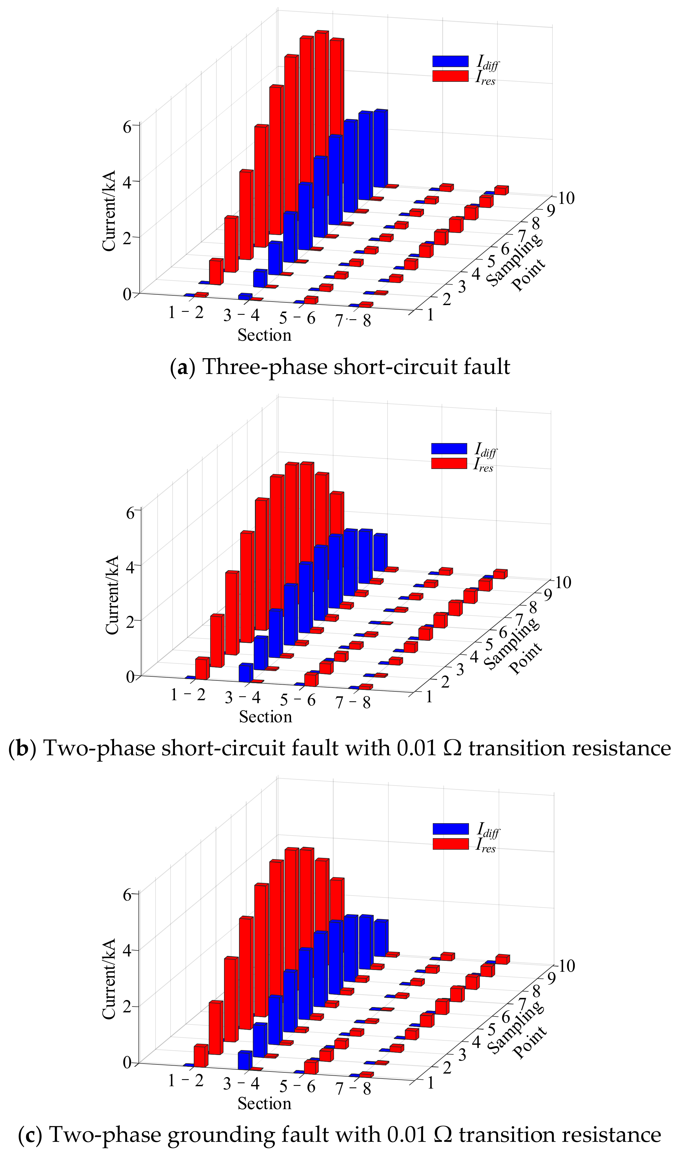 With the simulation settings unchanged, a three-phase short circuit, a two-phase short circuit with a 0.01 Ω transition resistance, and a two-phase-to-ground fault with a 0.01 Ω transition resistance are applied at the midpoint of section 3–4. The distributions of differential current and restraint current under different fault types are shown in Figure 9, and the fault identification results are presented in Table 4.