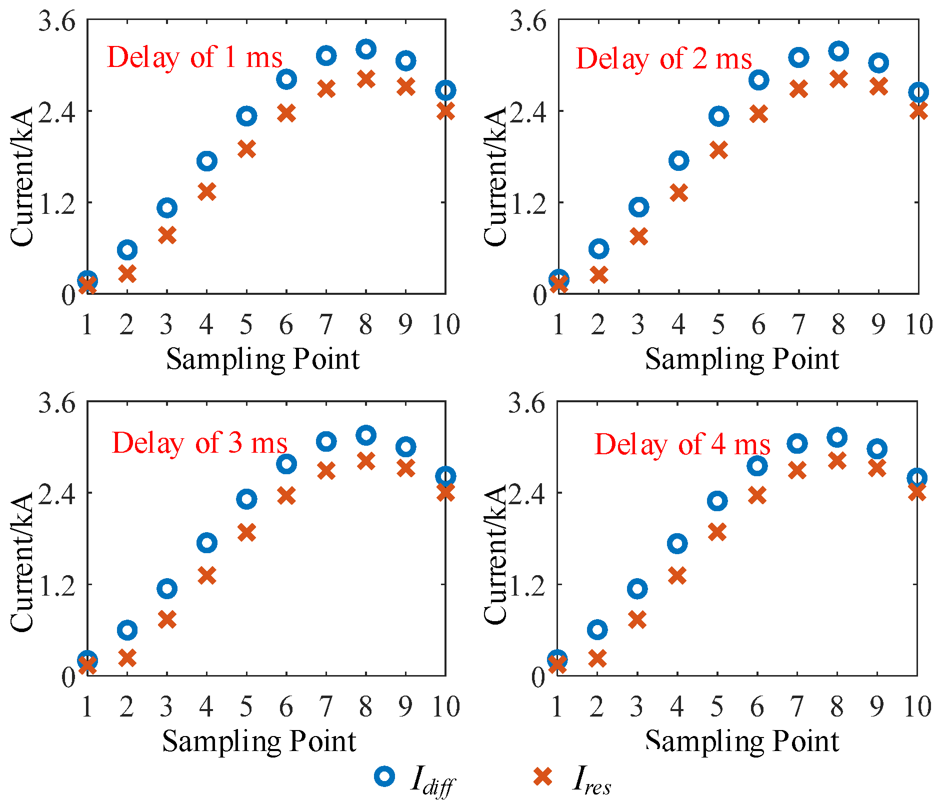 As can be seen from Figure 10, when a three-phase short-circuit occurs in the system, even if the sampling times of the currents at both ends of the protected section are not synchronized, the proposed adaptive current differential protection method can still ensure that the differential current exceeds the restraint current for more than 50% of the sampling points, achieving accurate fault identification and clearance.