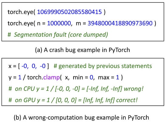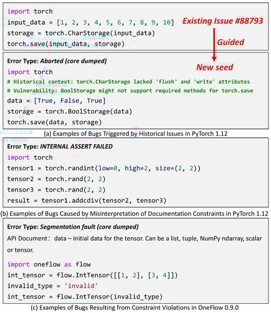 We evaluated three DL libraries using our approach, and the summary of the detected bugs is presented in Table 10. In total, 51 bugs were identified, of which 17 were confirmed to be previously unknown. These bugs have been reported to the developers for further verification and confirmation. And these bugs may cause the program to crash during execution, thereby potentially leading to denial-of-service attacks. A detailed list of the bugs can be found in our GitHub repository (https://github.com/deepliao/Bug_list, accesssed on 24 September 2025). Below, we present examples of the bugs detected by our approach, which originate from different libraries.