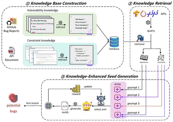 Our approach differs from previous methods by incorporating historical vulnerability knowledge as well as constraint knowledge from API documentation to guide LLMs’ seed generation. Additionally, we design multiple prompts with different types of knowledge and utilize an MAB model for dynamic prompt selection. This strategy enhances the comprehensiveness of our testing.