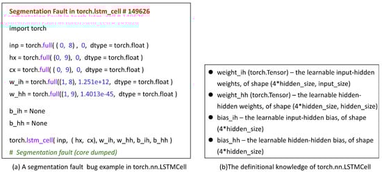 On the one hand, such constraint knowledge can guide LLMs to generate syntactically valid seeds. On the other hand, deliberately violating these constraints can also expose latent bugs. As illustrated in Figure 3a, we discovered a segmentation fault in PyTorch triggered during the use of torch.lstm_cell. Upon careful analysis, we identified that the root cause lies in the violation of parameter constraints within torch.lstm_cell. Specifically, the size(0) (i.e., the first dimension) of parameters such as w_ih and w_hh is not properly validated, although it is required to be . As a result, the unsafe_chunk operation fails to correctly partition the gates into four parts. Consequently, due to the illegal size(1) (i.e., the second dimension) of the gates tensor, an out-of-bounds access occurs when invoking operator[], ultimately leading to a segmentation fault. This case underscores the importance of adhering to the documented parameter constraints of torch.lstm_cell, which are detailed in Figure 3b.