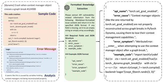 Figure 4 illustrates a complete example of vulnerability knowledge extraction from issue ID 124900 in the PyTorch repository. First, we used a crawler to obtain the issue content and removed HTML tags and irrelevant formatting to obtain the cleaned core text, as shown on the left. This includes the issue title, sample code, error messages, and cause analysis, which together serve as the raw input for knowledge extraction. The central panel presents the prompt designed to guide the LLM, which specifies the task objectives and provides examples to standardize the output format and element representation. The right panel shows the structured vulnerability knowledge extracted from this issue, covering the key components of API name, error causes, error symptoms, and example code. Considering that a single bug report may involve multiple APIs and thus provide valuable guidance for testing several APIs simultaneously, we further vectorize the extracted results and store them in a Chroma vector database to support efficient semantic retrieval and cross-API knowledge association.