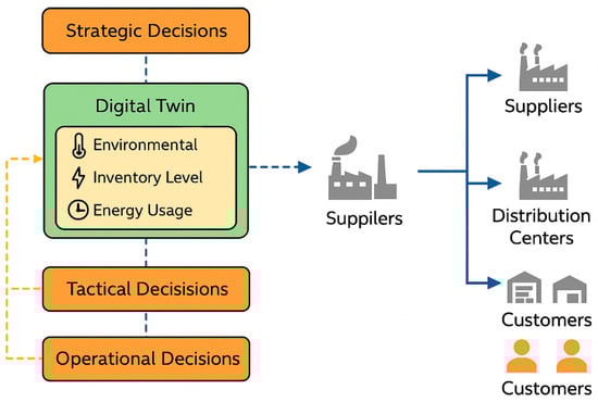 At the same time, traditional optimization approaches, often based on static and deterministic assumptions, have shown limitations in effectively handling real-time variability and uncertainty. To address this gap, researchers and practitioners are increasingly turning to the integration of Internet of Things (IoT) and Digital Twin (DT) technologies. IoT enables the collection of real-time data from supply chain nodes such as warehouses, transport fleets, and production lines [], while digital twins offer virtual simulations of physical systems, facilitating scenario testing, anomaly detection, and predictive analytics [,].