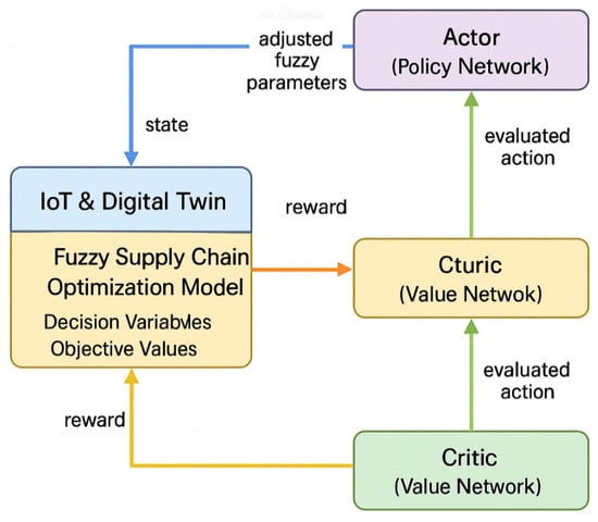 An emerging solution lies in the use of adaptive learning mechanisms, particularly reinforcement learning techniques such as DDPG (Deep Deterministic Policy Gradient). These models can bridge the gap between data collection and decision-making by learning to adjust fuzzy parameters dynamically based on feedback [,]. Yet, few studies have successfully operationalized this feedback loop within a fully integrated, real-time supply chain optimization model [,].