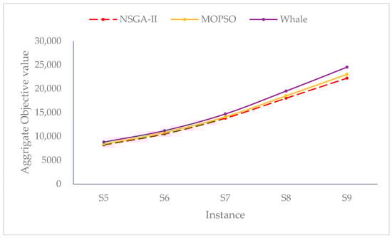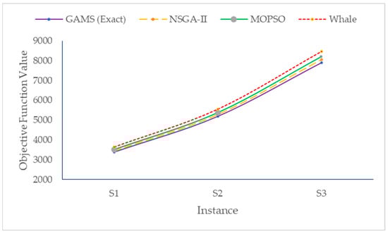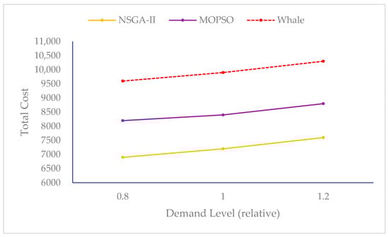 In the first analysis, the fuzzy demand level was varied in the range of 80% to 120% of the baseline value to examine its impact on the total cost of the supply chain. As can be seen in Figure 7, the increase in demand level caused a relatively linear growth in the value of the economic objective function, but the magnitude of this increase varied among the algorithms. The NSGA-II algorithm, with higher adaptability, was able to control the costs and showed a smoother increase slope than the other algorithms. In contrast, the Whale algorithm was more sensitive to the increase in demand and recorded the highest cost at level 1.2.