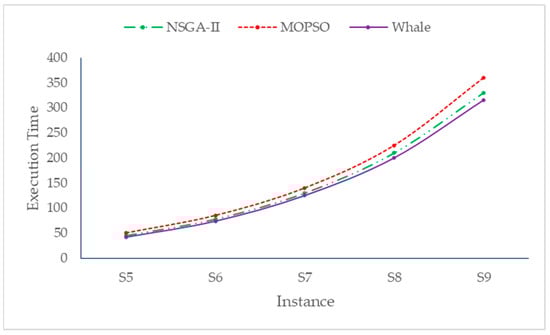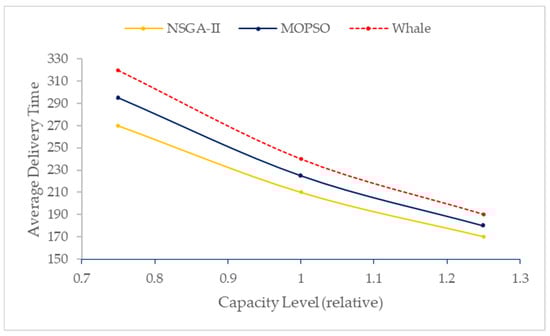 In the second step, the capacity of resources, including production, storage, and transportation, was changed in the range of 75% to 125% to analyze its impact on the average delivery time of the goods. The results presented in Figure 8 show that reducing the capacity caused a significant increase in the response time, especially in the MOPSO algorithm, whose performance was significantly slower under resource constraints. Even at low-capacity levels, the NSGA-II algorithm was able to maintain the delivery time within an acceptable range by optimally reallocating resources and routes. With increasing capacity, all three algorithms experienced a reduction in time, but the dominant algorithm remained NSGA-II.
