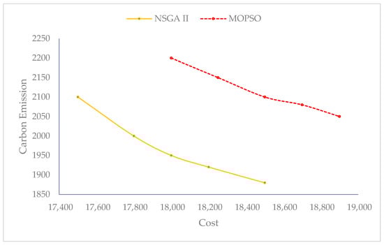 In terms of optimization techniques, metaheuristic algorithms like NSGA-II, MOPSO, and the Whale Optimization Algorithm have gained popularity due to their scalability and flexibility. Unlike traditional linear programming methods, these algorithms can handle large, nonlinear, and non-convex problems that are common in real-world supply chains [,]. NSGA-II is well-regarded for producing diverse Pareto fronts and rapid convergence [], while MOPSO offers high computational efficiency. The Whale Optimization Algorithm, though newer, is gaining attention for its dual-phase search capabilities [,].