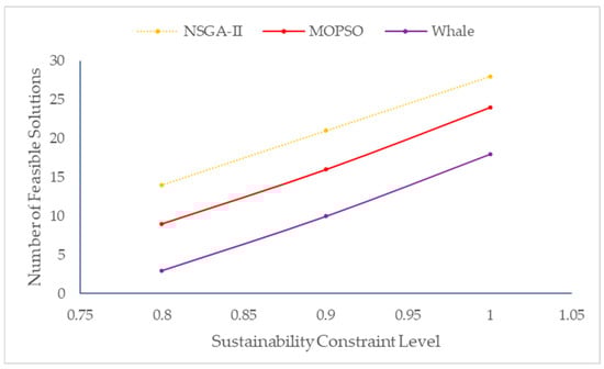 Finally, in the third sensitivity analysis, the system stability constraints were considered more stringent. For this purpose, the allowable carbon emissions and energy consumption were reduced by 10 percent and 20 percent, respectively. Figure 9 shows the trend in the number of feasible non-dominated solutions for each algorithm in the face of these constraints. It can be seen from this graph that NSGA-II, while maintaining the Pareto front structure, was able to provide an acceptable number of solutions even under the most stringent conditions, while the whale algorithm lost almost all of its answers at the stringent level (0.8). The MOPSO algorithm also experienced a sharp decrease in the number of answers and showed less stability than NSGA-II.