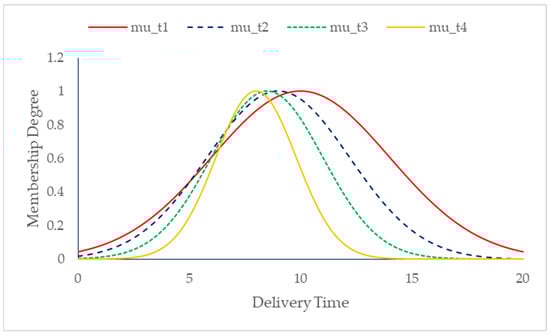 Next, Figure 11 shows how the fuzzy membership functions for one of the key parameters (e.g., delivery time) are updated over 4-time intervals using real-time data. It can be seen that the initial membership function, which has a wide and uncertain range, gradually becomes a more accurate and narrower function focusing on more probable values.